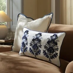 Indigo Collection Saphira White & Blue Floral Rectangular Cushion – Hand-Embroidered Beadwork