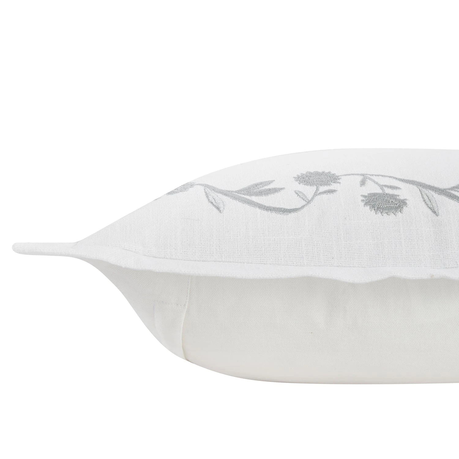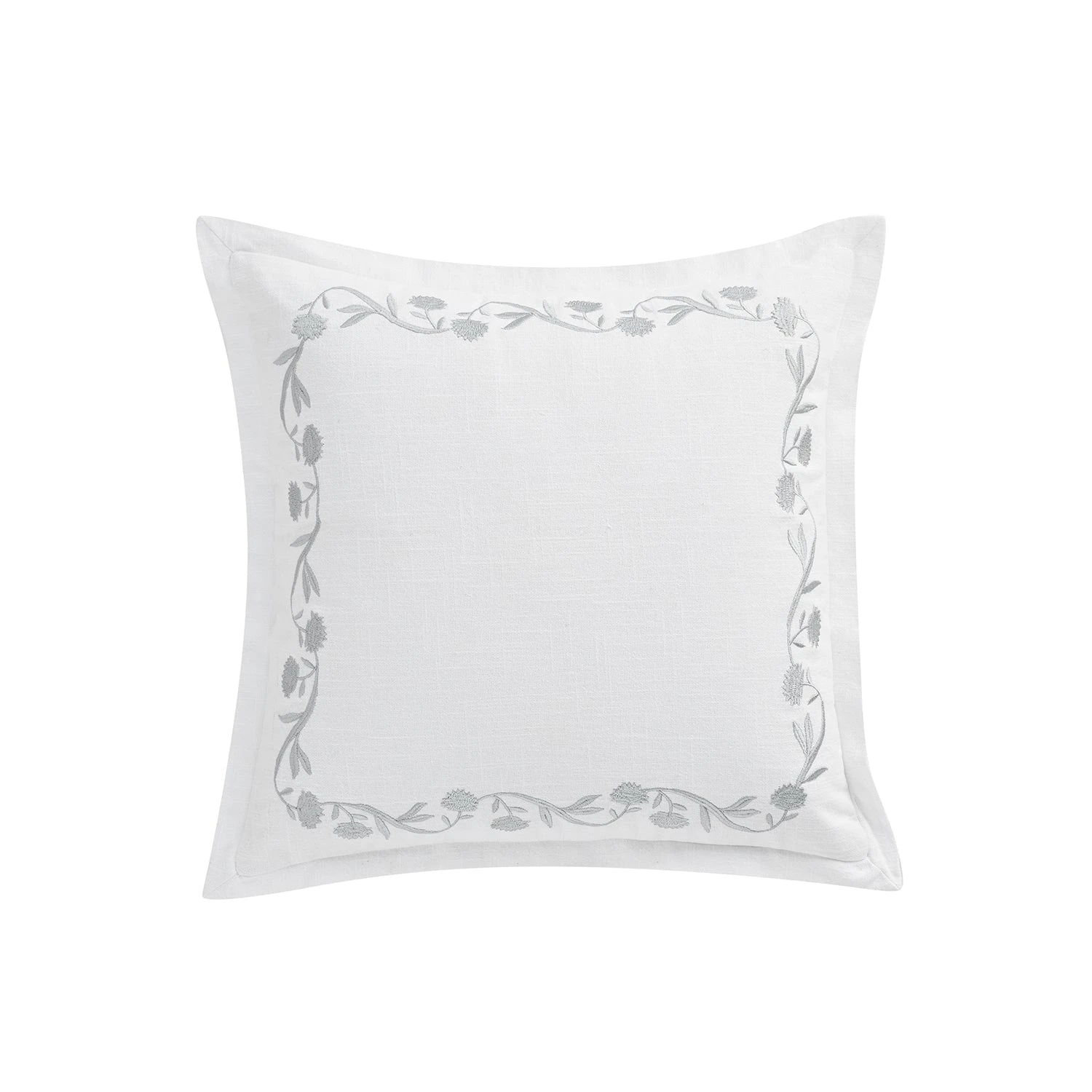Add a touch of romanticism and sophistication to your living space with the Adeline Moonshine Grey Floral Embroidered Cotton Cushion. This elegant piece features a pristine white cotton slub backdrop framed by a delicately embroidered floral vine border in satin moonshine grey, offering a subtle lustre that complements any interior.