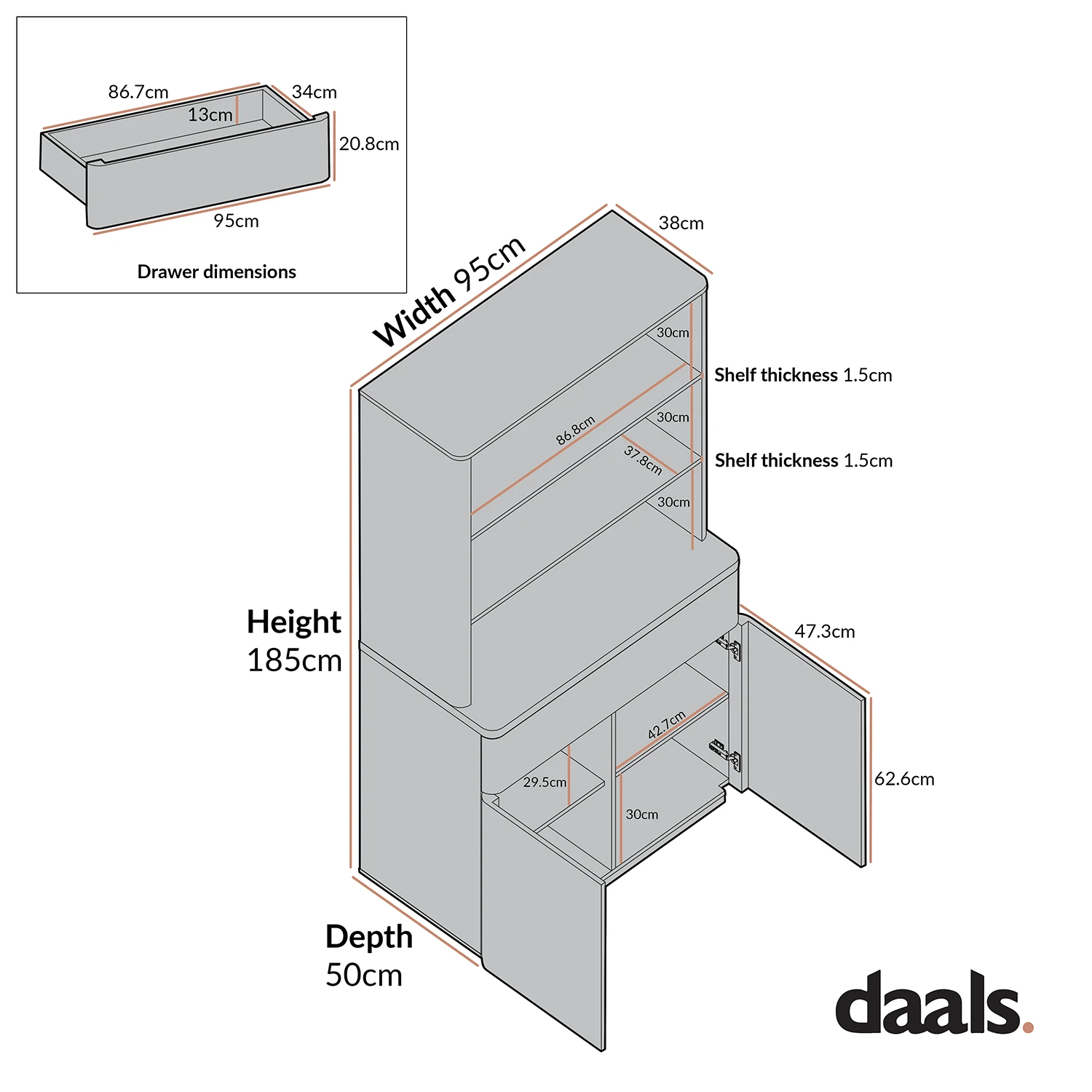 - Item size: W 95 x D 50 x H 185cm.