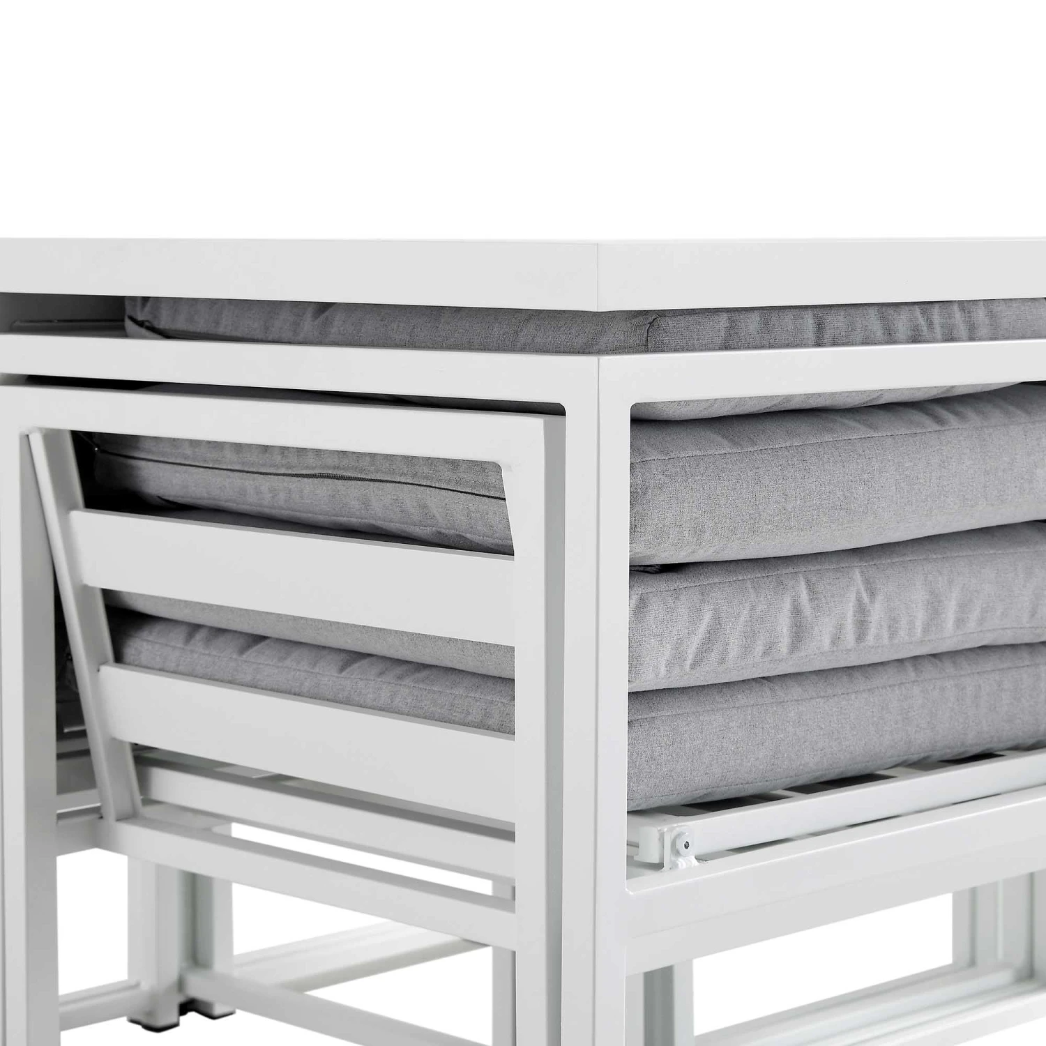 - Amply padded back and seat cushions are upholstered with UV resistant fabric in an elegant light grey colour to coordinate with theย white frame.