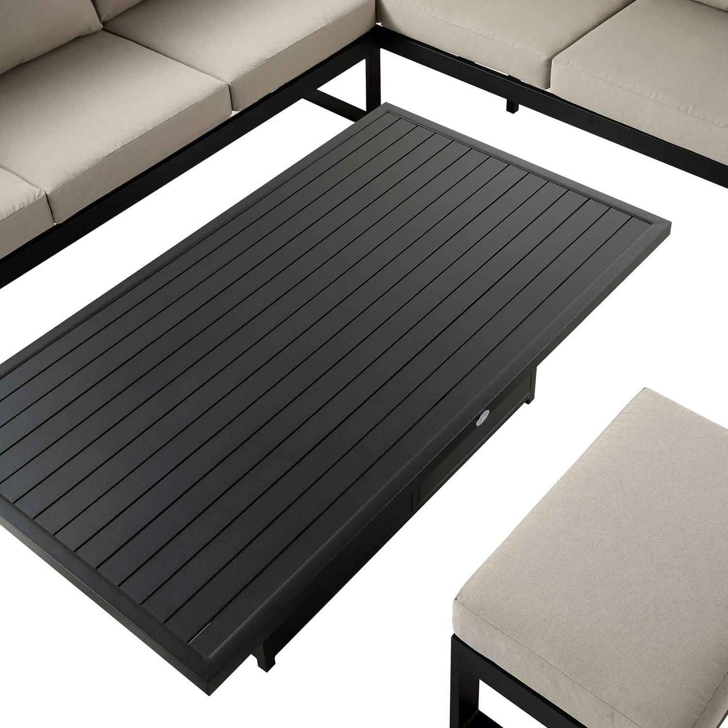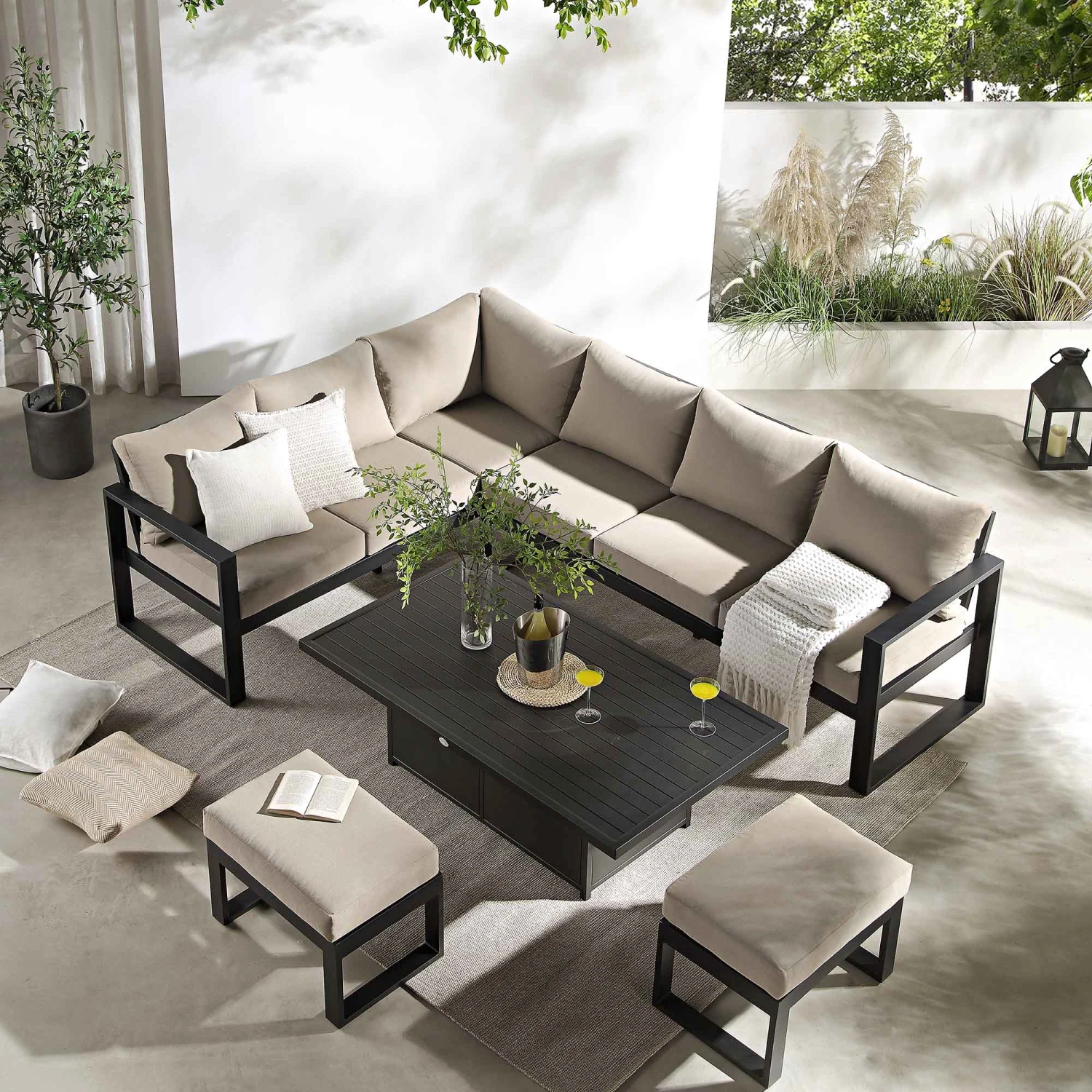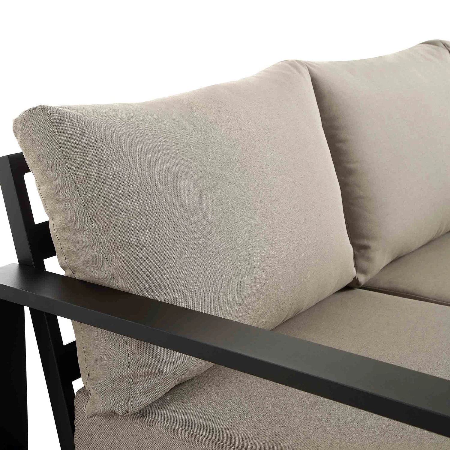 - Amply padded back and seat cushions are upholstered with UV resistant fabric in an chic taupe colour to coordinate the black frame.