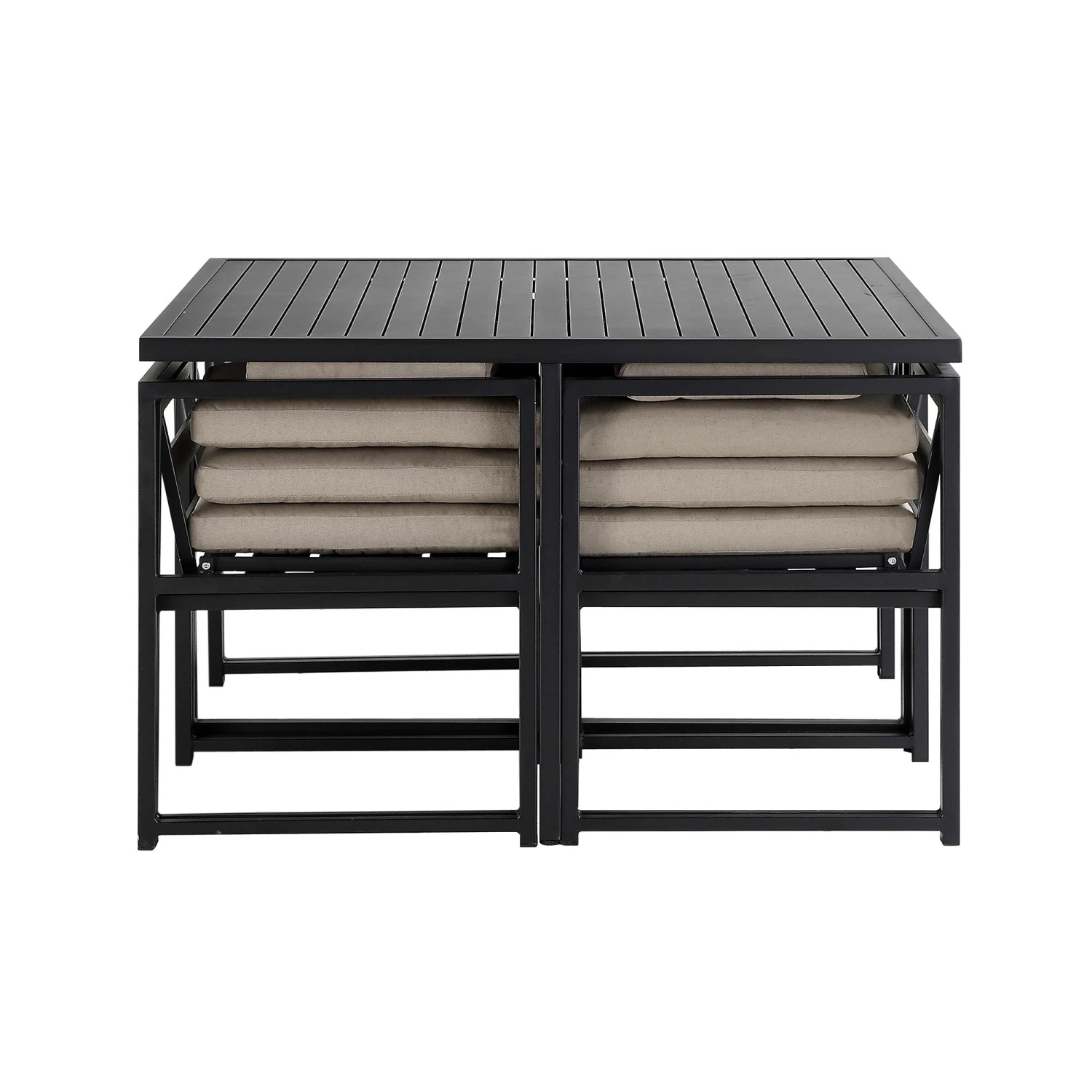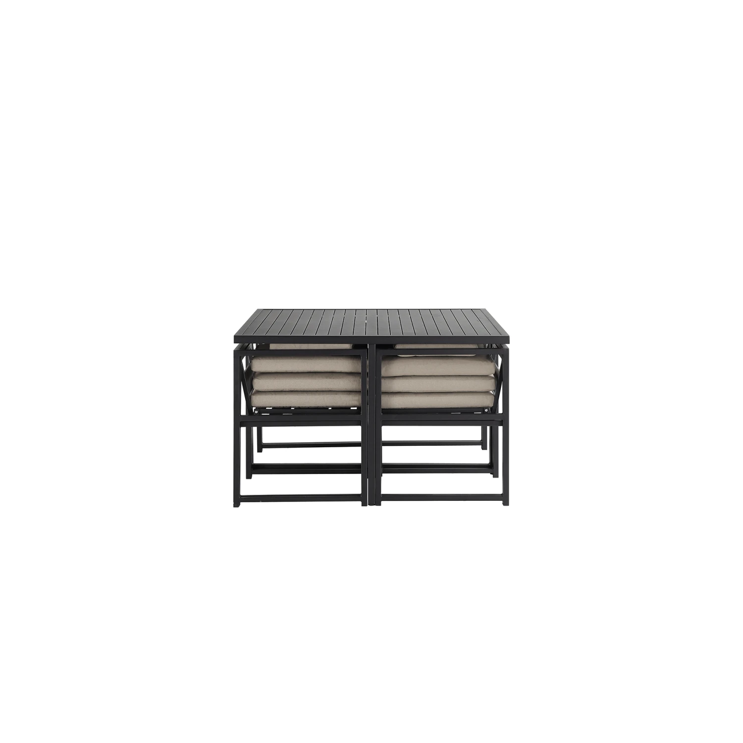 - Space-Saving Innovation: 4 armchairs and 4 armless stools tuck neatly under the table to form a compact cube.