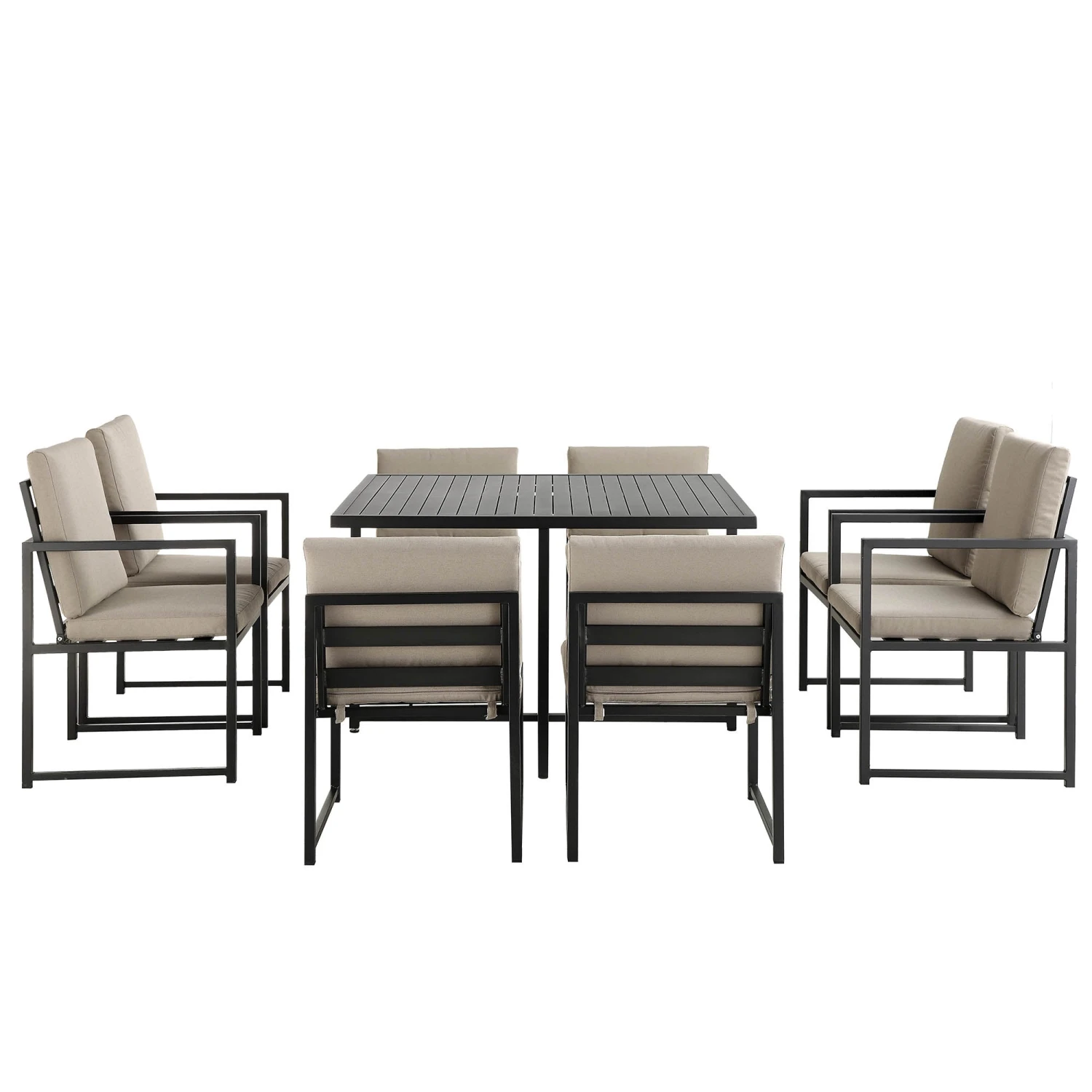 Maximize your garden’s potential with the Albany 9-Piece Outdoor Cube Dining Set. This masterfully designed collection combines contemporary aesthetics with ingenious space-saving functionality. Featuring a sleek matte black aluminium frame contrasted by sumptuous taupe cushions, this set offers a sophisticated look while providing comfortable seating for up to eight guests. The unique ‘cube’ design allows all eight chairs to nest perfectly beneath the table, keeping your patio tidy and open when not in use.