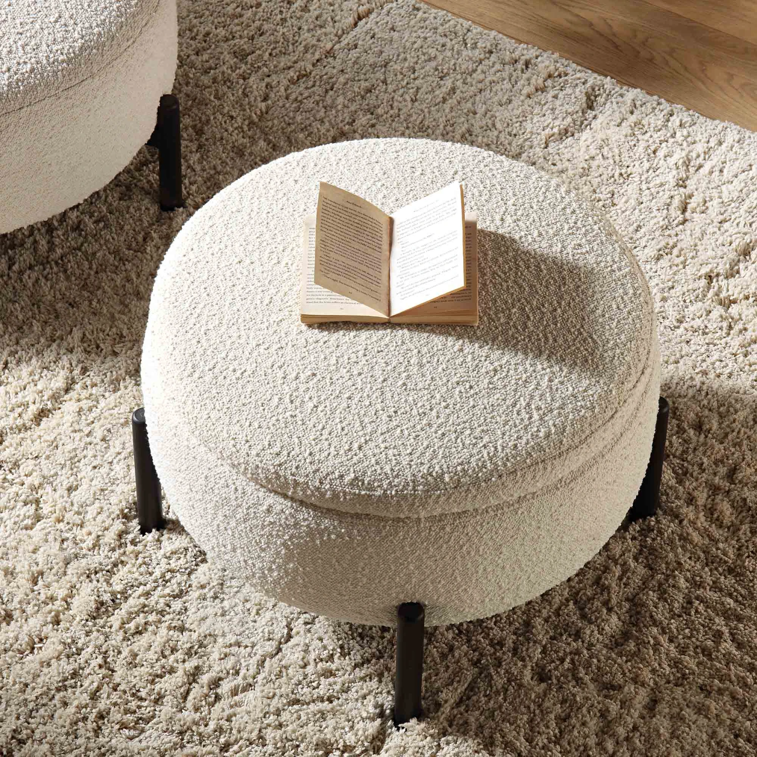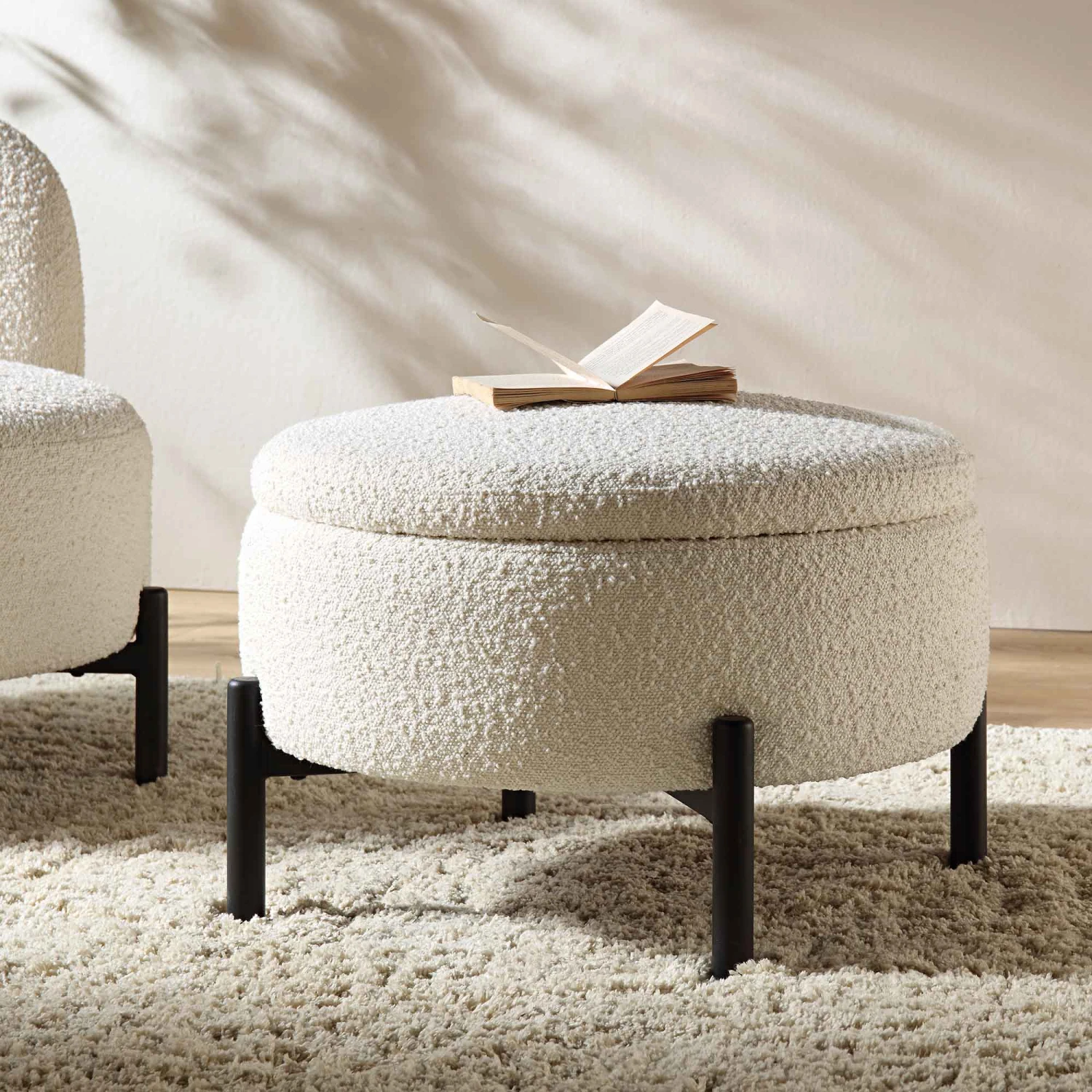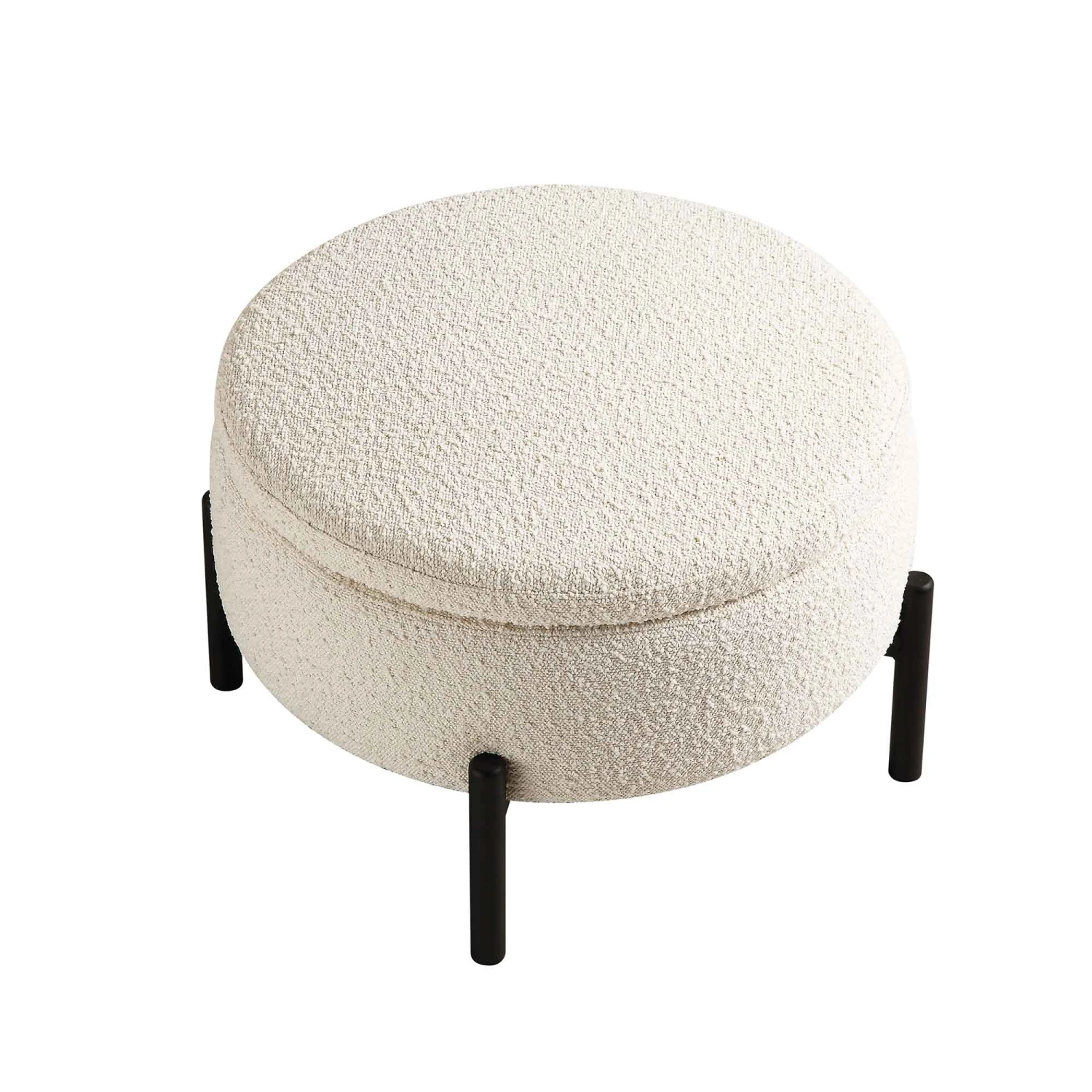 This pouffe features a plush, textured cream-toned boucle fabric that offers both soft comfort and visual depth. The rounded silhouette is elegantly supported by slender, matte black metal legs, creating a balanced contrast between soft upholstery and industrial-inspired hardware. Beneath the lid lies a discrete internal storage compartment, allowing you to declutter your space while keeping essentials neatly tucked away.