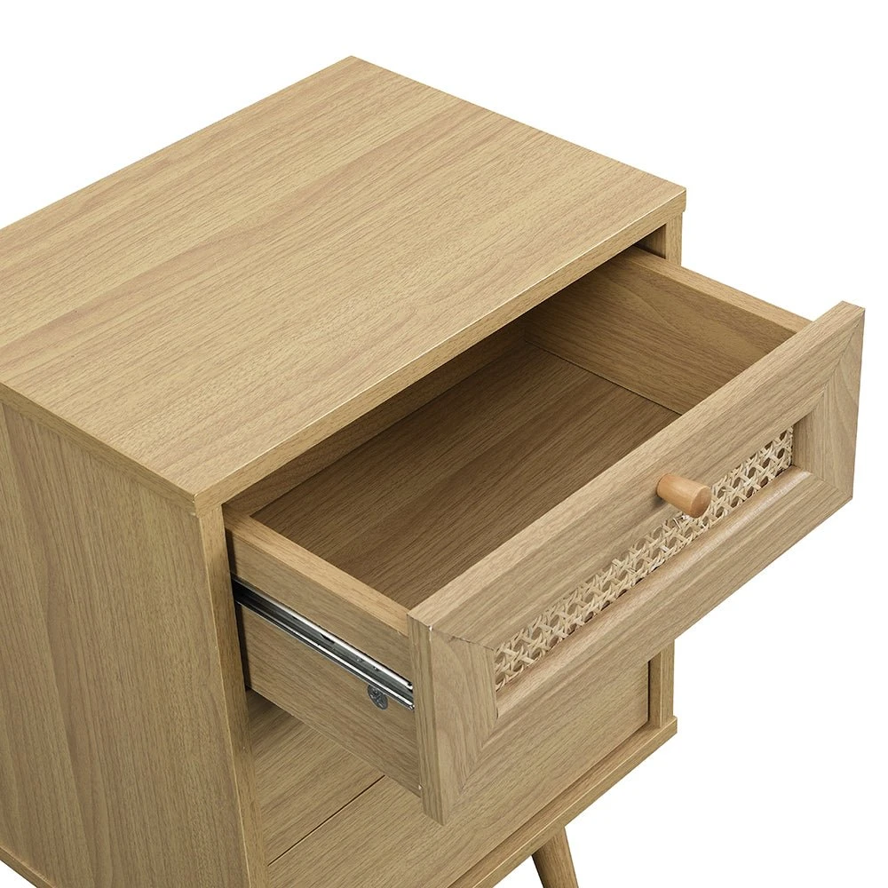 - Our Anya bedside table is designed with beautiful natural woven rattan drawer door and solid wood drawer handles.