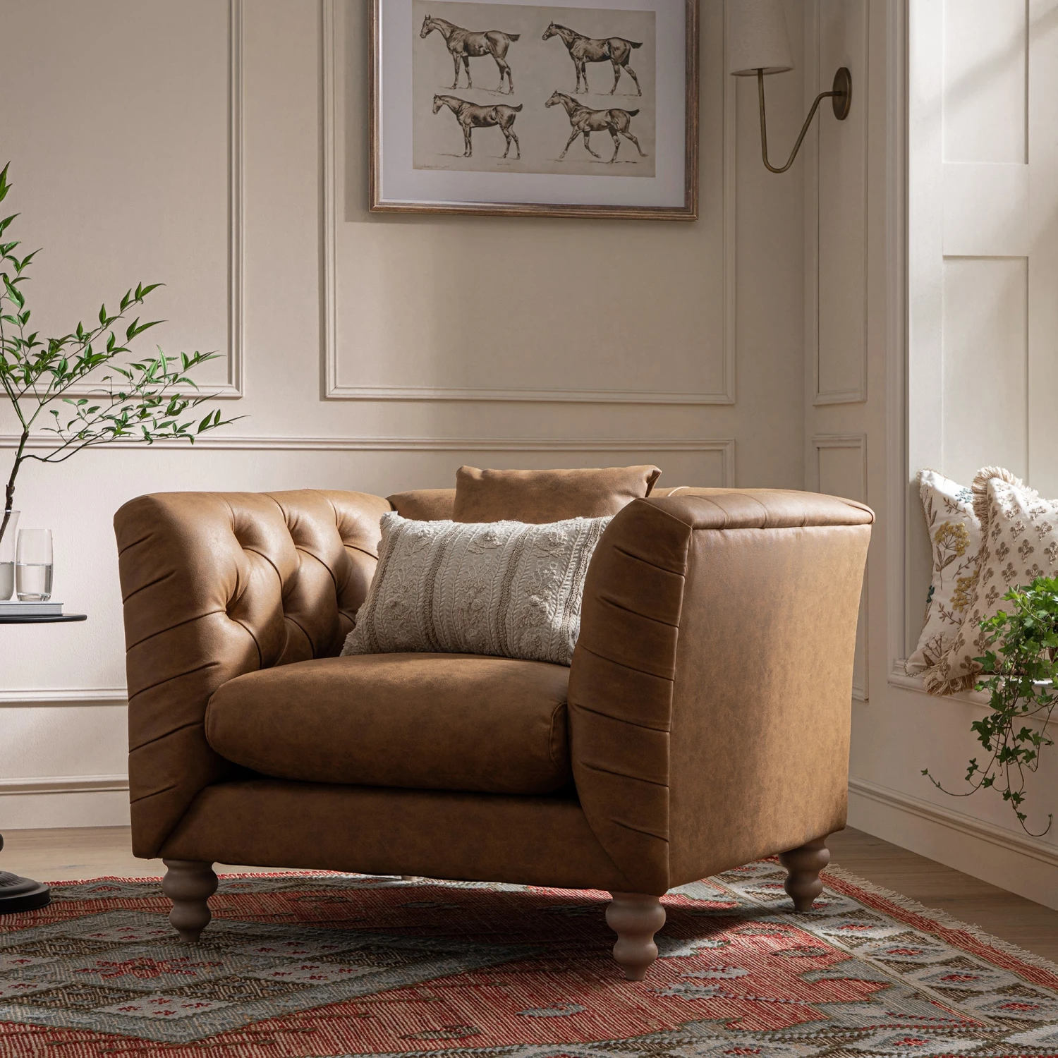 - Complete the look: Pictured with our Ashby Chesterfield Tan Faux Leather Armchair is our Maison Neutral Sophia Jute Lace Embroidered Cushion and Farah Kilim Traditional Handwoven Wool & Jute Deep Red Rug.