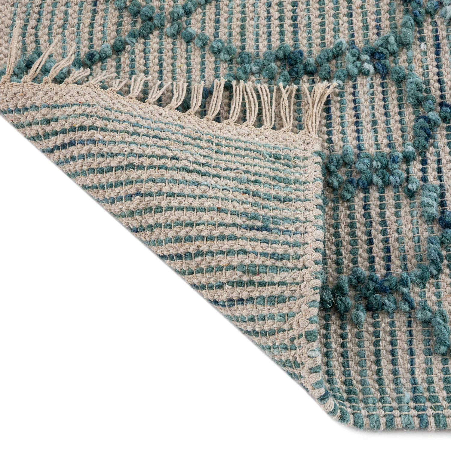 Each Avanti rug is a bespoke work of art, handmade by local artisans in India using traditional weaving techniques. The visual appeal lies in its sophisticated symmetrical geometric pattern, blending tie-dye wool in tones of deep blue, emerald green, and bright aqua to create a stunning two-toned effect. The look is elevated by a raised bubble weave that adds a tactile, 3D dimension, finished with delicate handwoven tassels for an authentic touch.