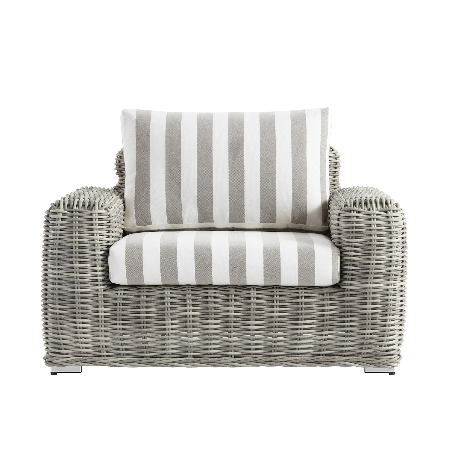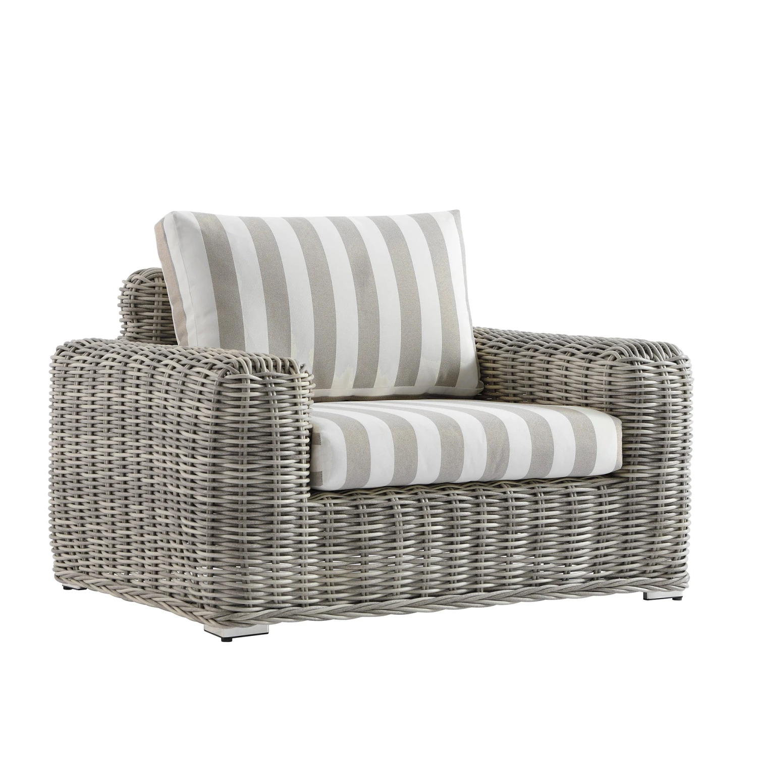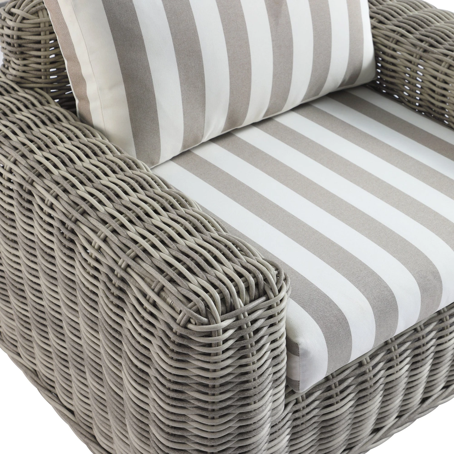 This piece features a sophisticated palette of subtly distressed light grey wicker hand-woven into a thick, round profile. The back and seat cushions are dressed in a classic light taupe stripe, offering a timeless aesthetic that provides a crisp contrast to the textured rattan frame. Wide armrests and a deep-seated profile emphasize its premium comfort and stature.