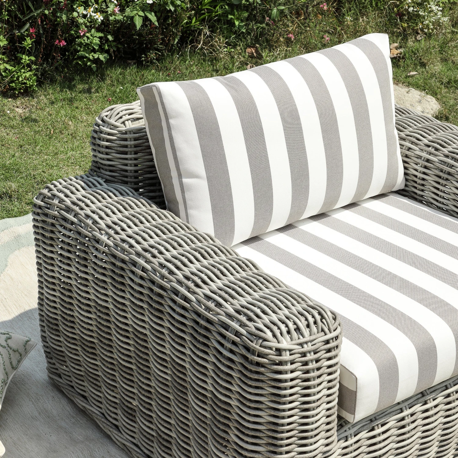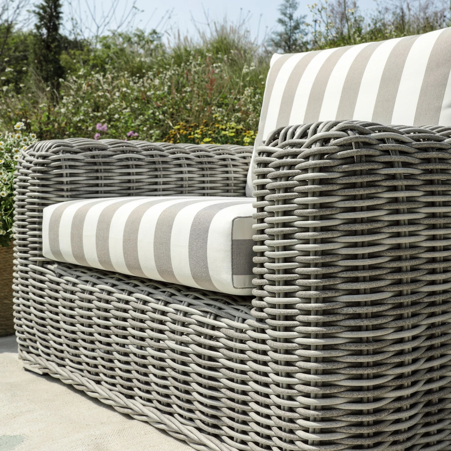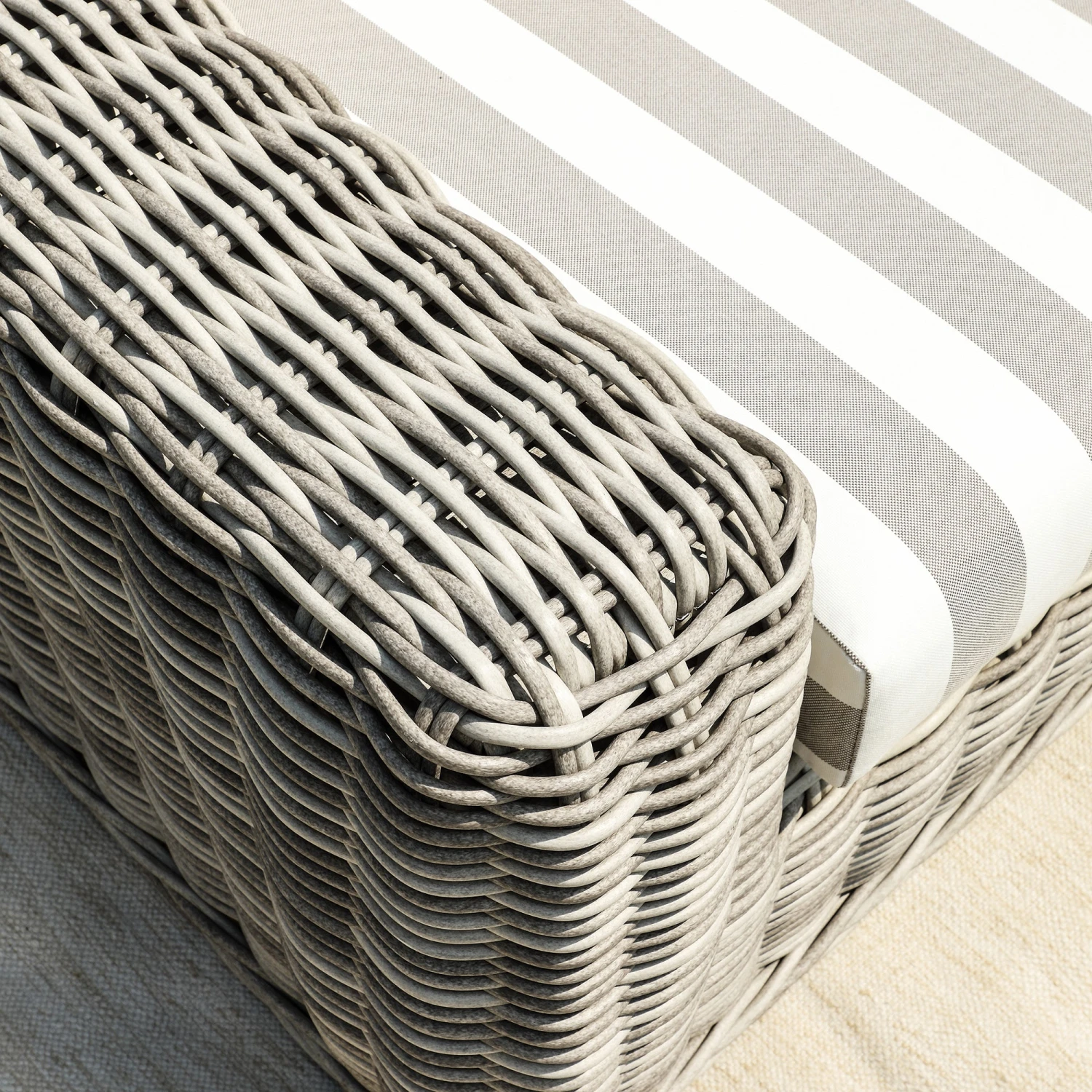 This piece features a sophisticated palette of subtly distressed light grey wicker hand-woven into a thick, round profile. The back and seat cushions are dressed in a classic light taupe stripe, offering a timeless aesthetic that provides a crisp contrast to the textured rattan frame. Wide armrests and a deep-seated profile emphasize its premium comfort and stature.