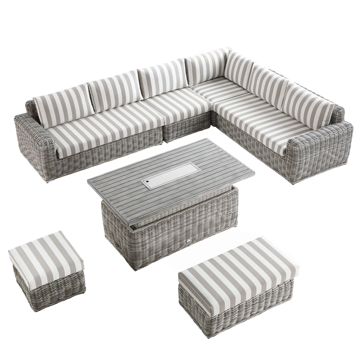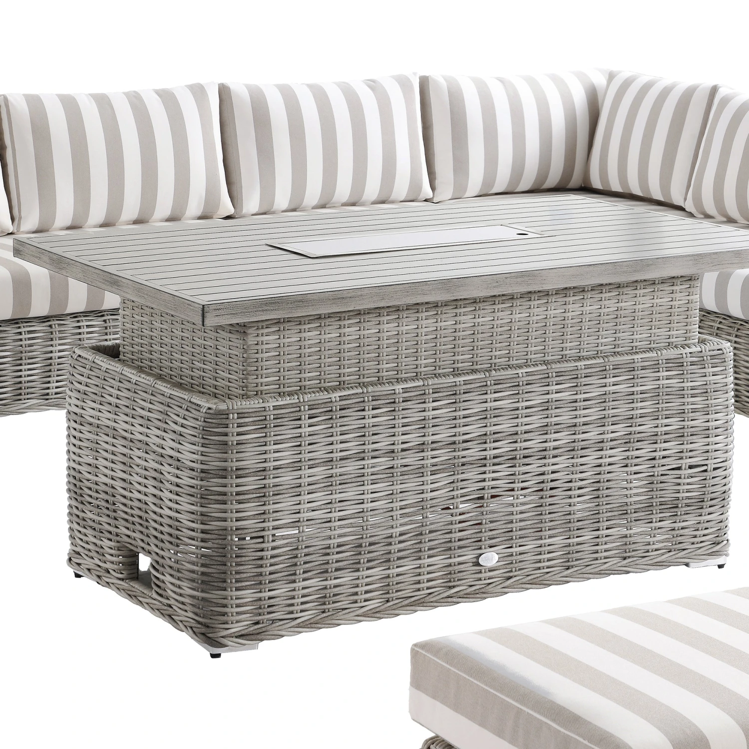 - Beautiful weather-resistant taupe striped fabric upholstered back and seat cushions perfectly coordinate with the distressed light grey colour wicker rattan, creating a focal point in your outdoor space.