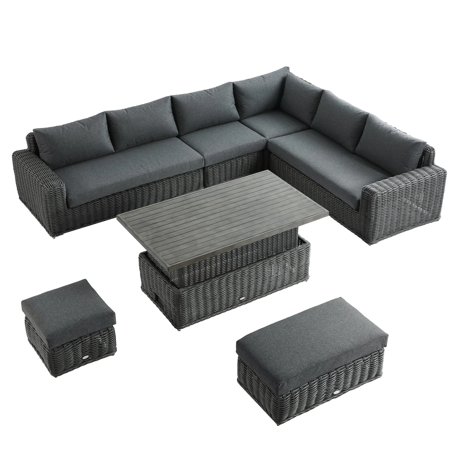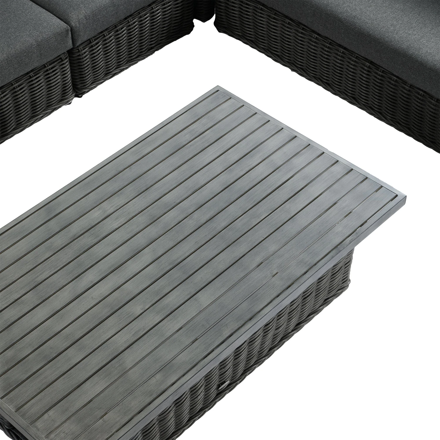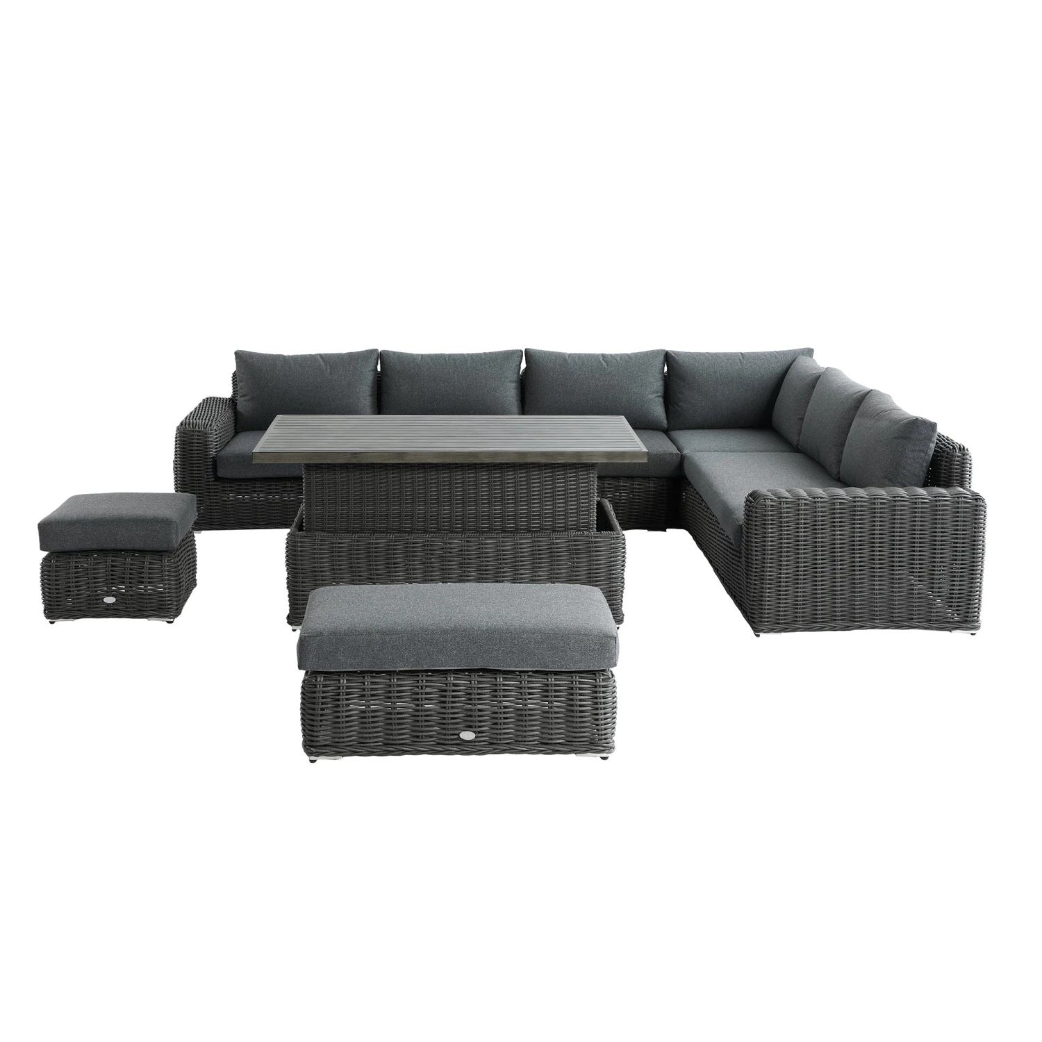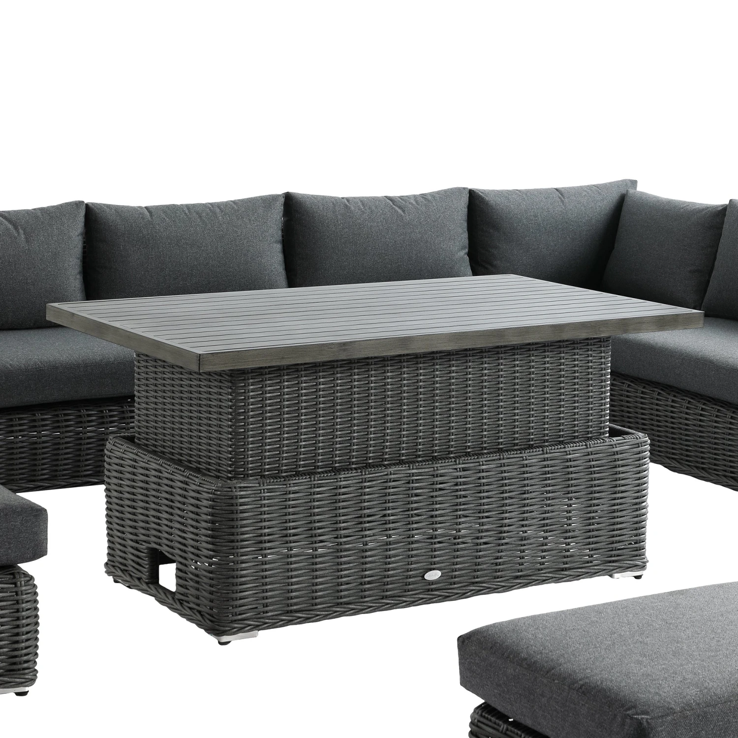 - The set comes with a easy-to-use slatted aluminium rising table with a brushed wooden effect finish, transforming the set from a perfect lounging set to a dining set with minimal effort.