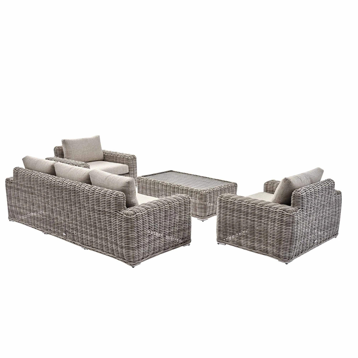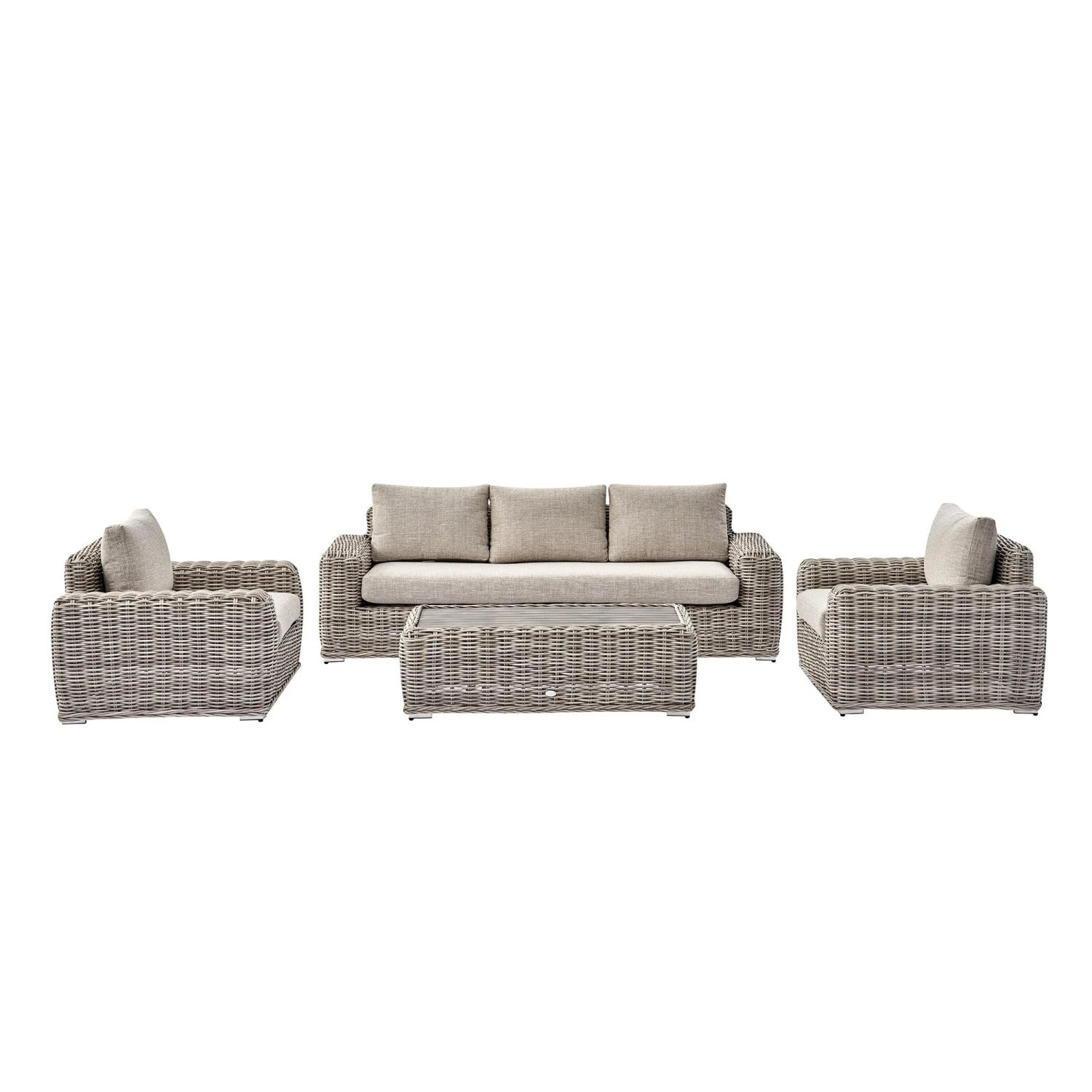 - Crafted from robust round wicker weaves and internal aluminium frames, the hard-wearing outdoor set comprises of a 3-seater sofa and two armchairs, providing plenty of seating space for those outdoors tea parties.