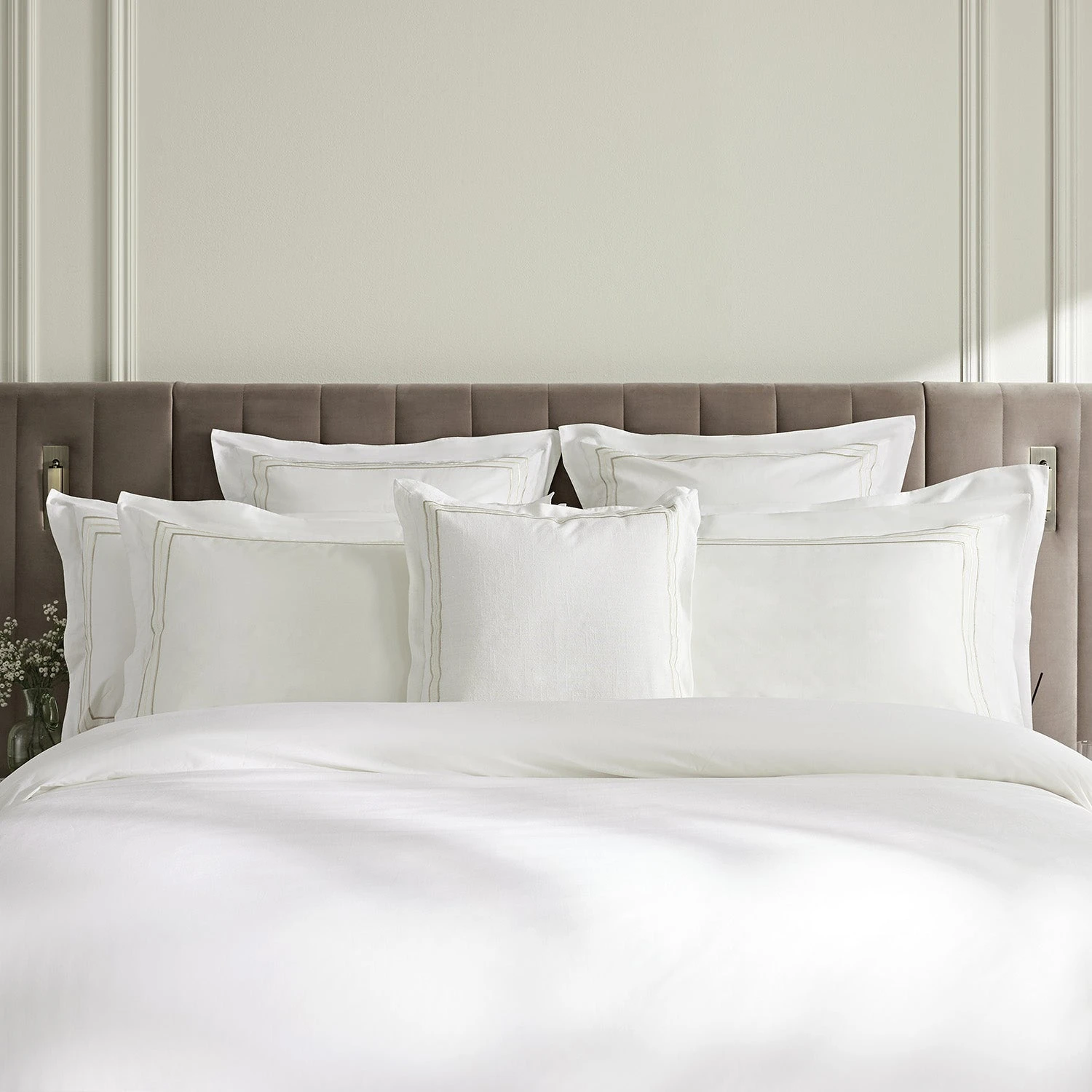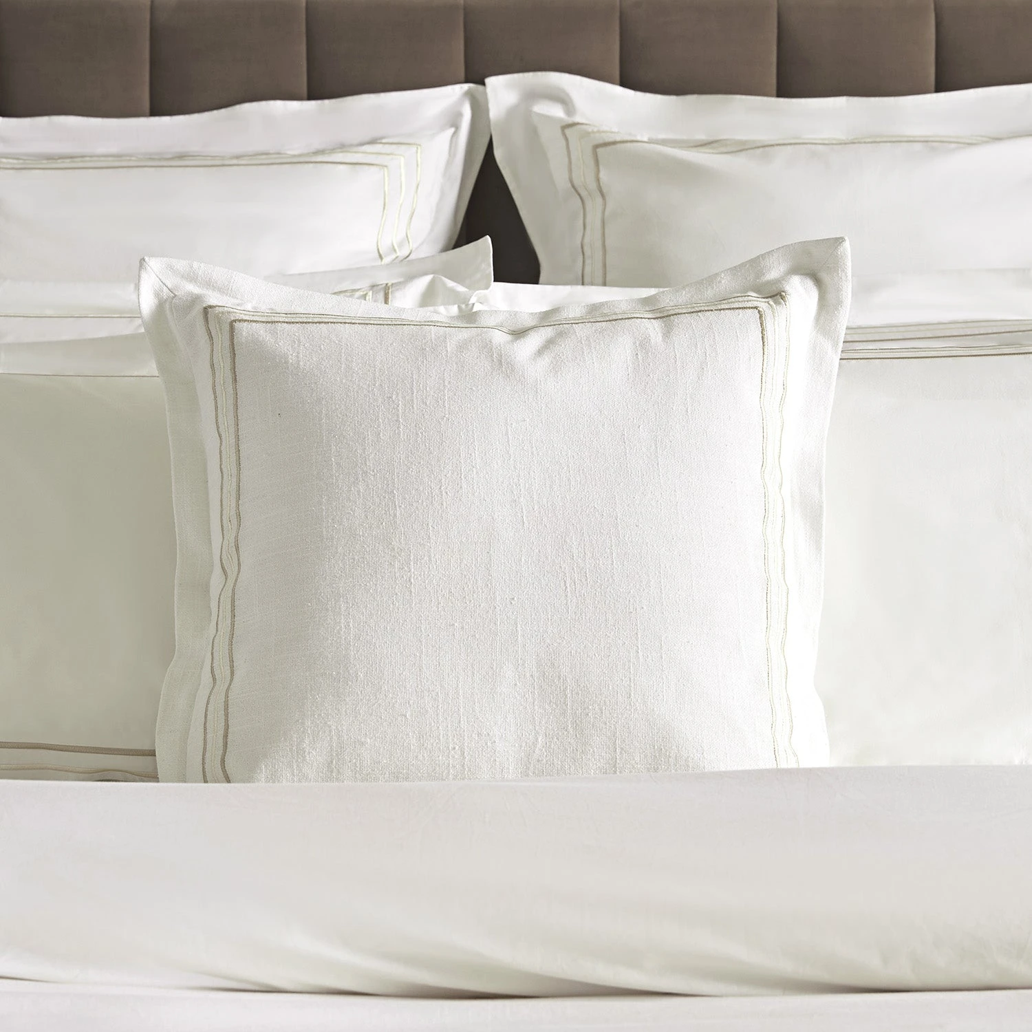 Crafted from premium 100% cotton slub, this cushion features a pristine white base that serves as the perfect canvas for its standout detail: a sleek, triple-line embroidered border. The champagne gold satin stitch creates a tailored, high-end look that strikes the ideal balance between classic heritage and contemporary style.