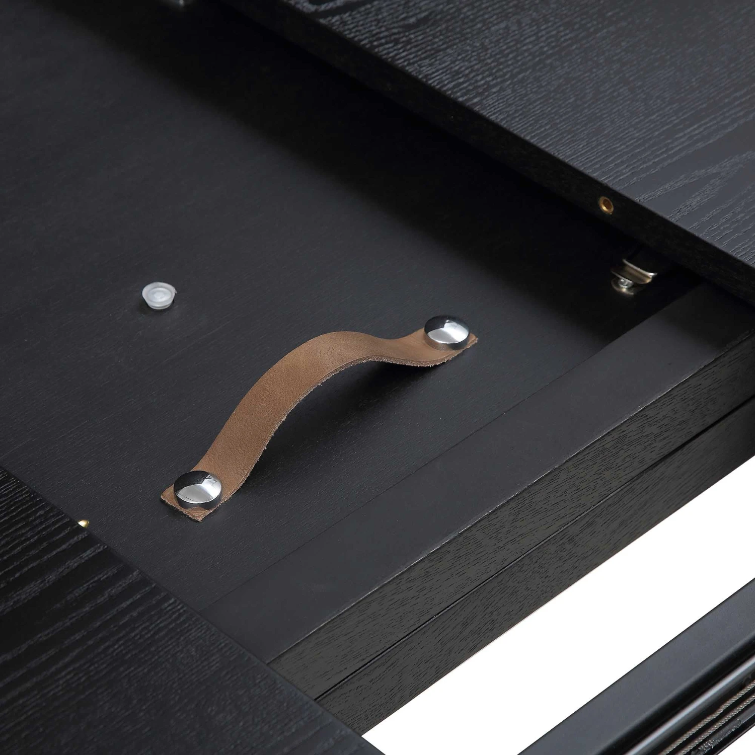- The table top finishes with solid oak veneer in black stained finish, therefore each piece comes with unique natural pattern ofย wood grains and knots.
