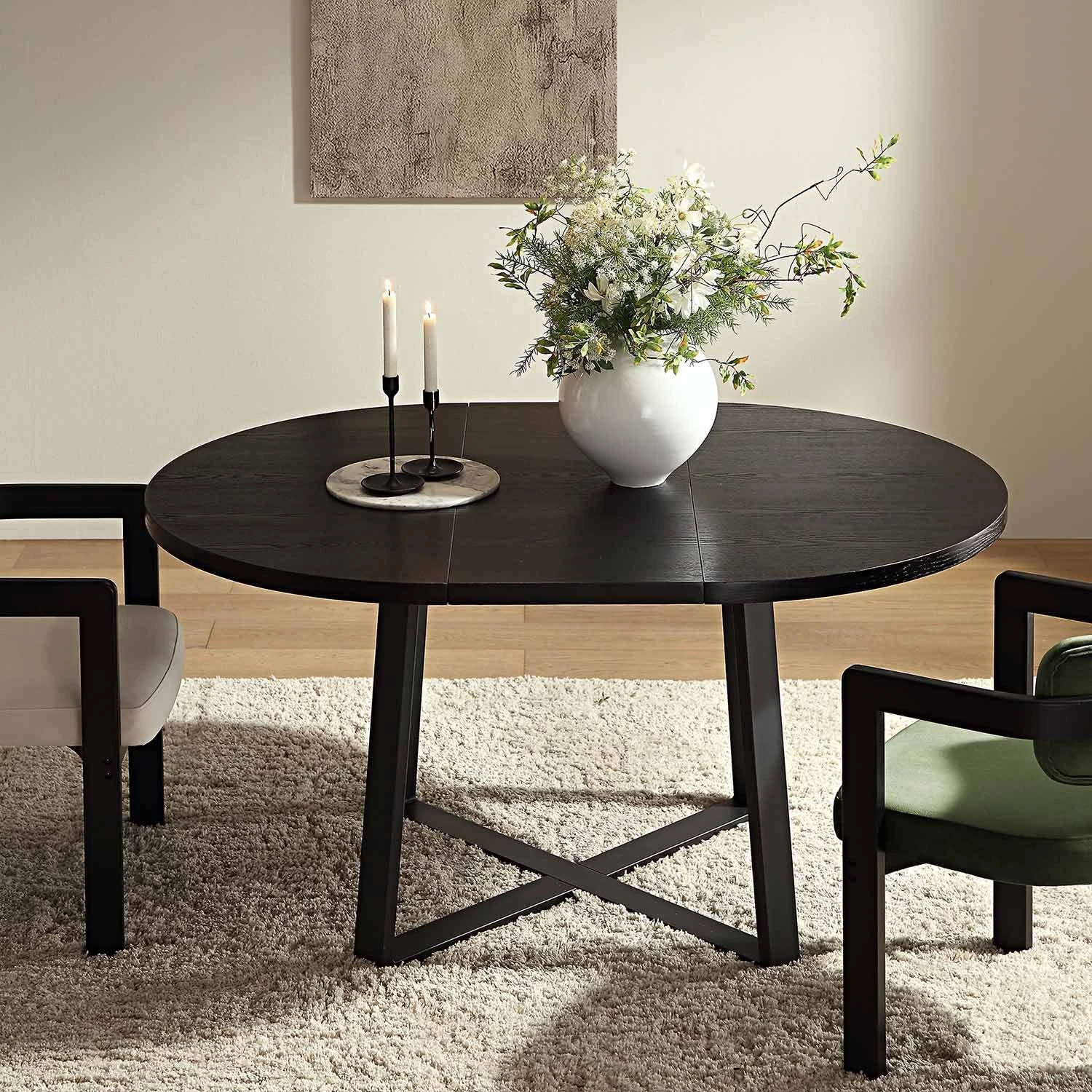 - ๏ปฟComplete the look:ย ๏ปฟPictured with our Bern Extending Round Dining Table is our stylish Stanford Dining Chairs in Moss Green and Champagne Velvet