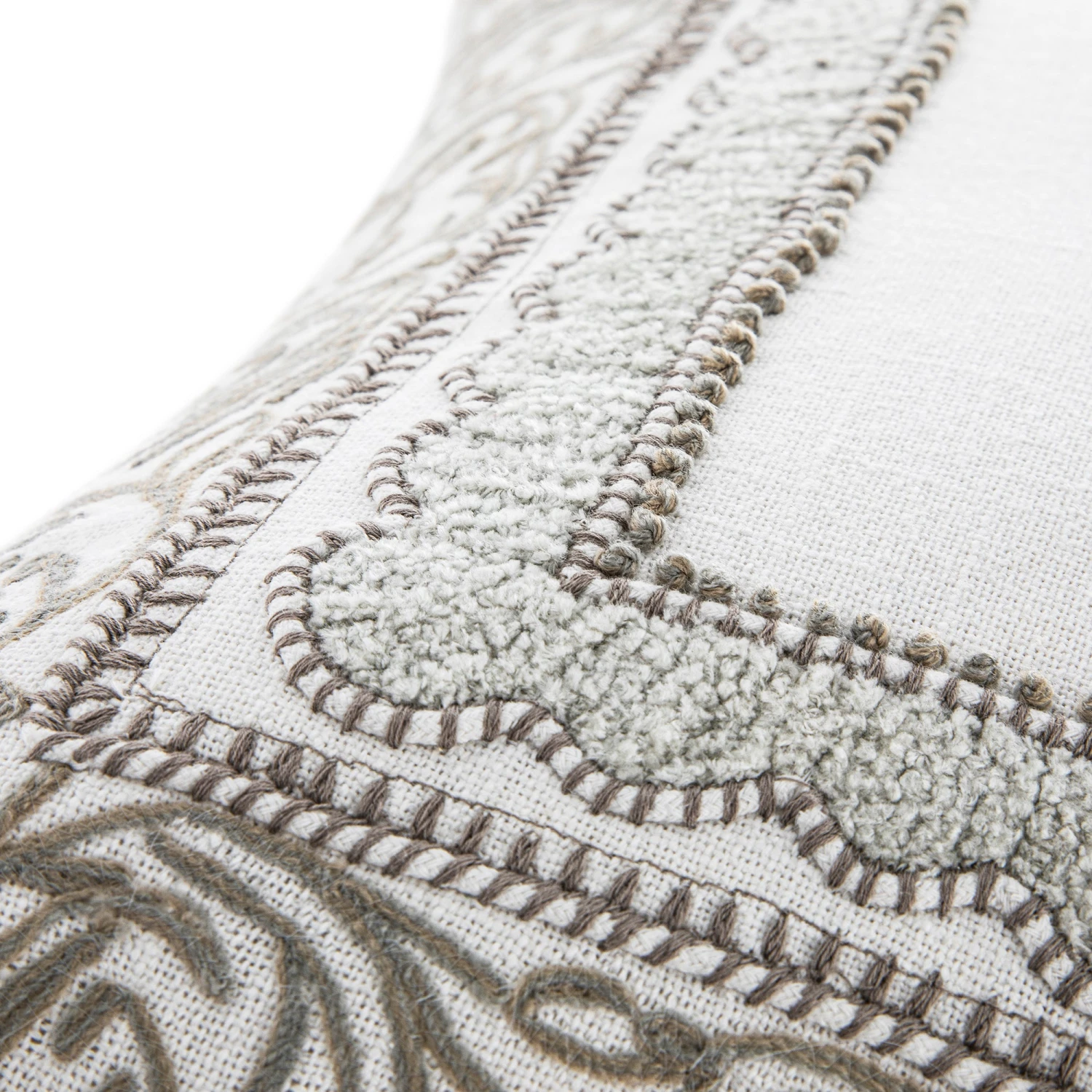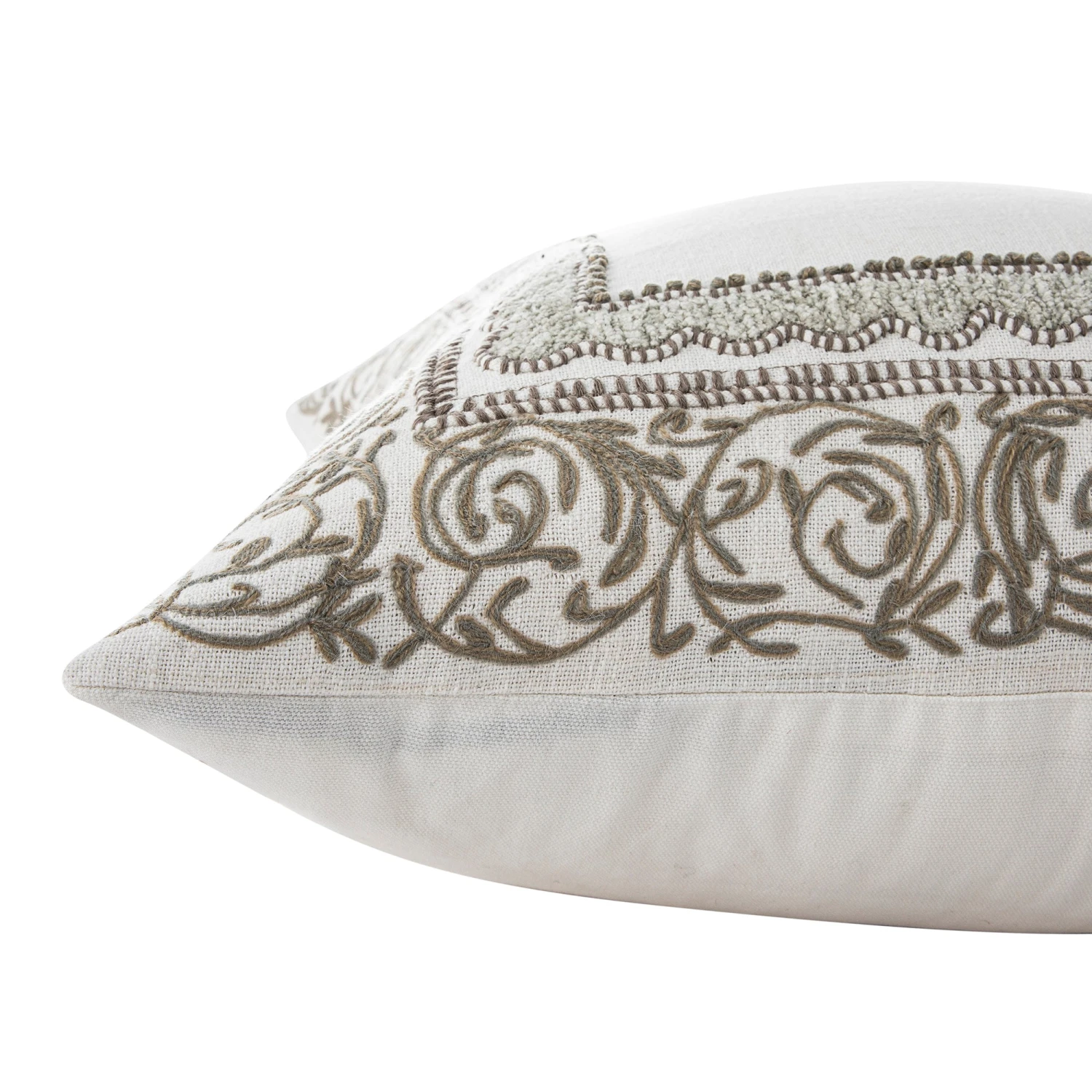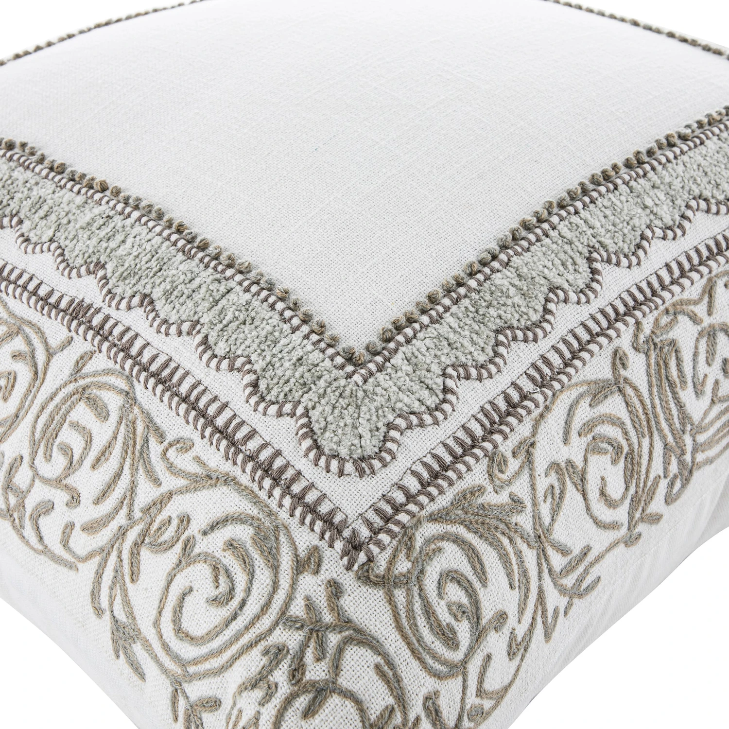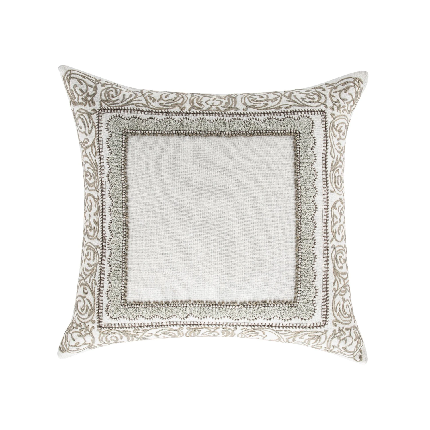 The centerpiece of this cushion is its stunning border design. Rendered in a soft grey and off-white contrast, the pattern features delicate vine motifs, elegant scalloped edges, and precise dotted accents. The texture is brought to life through a combination of handmade French knots and specialized chenille embroidery, creating a raised, convex effect that adds depth and a premium feel to the cotton duck fabric.