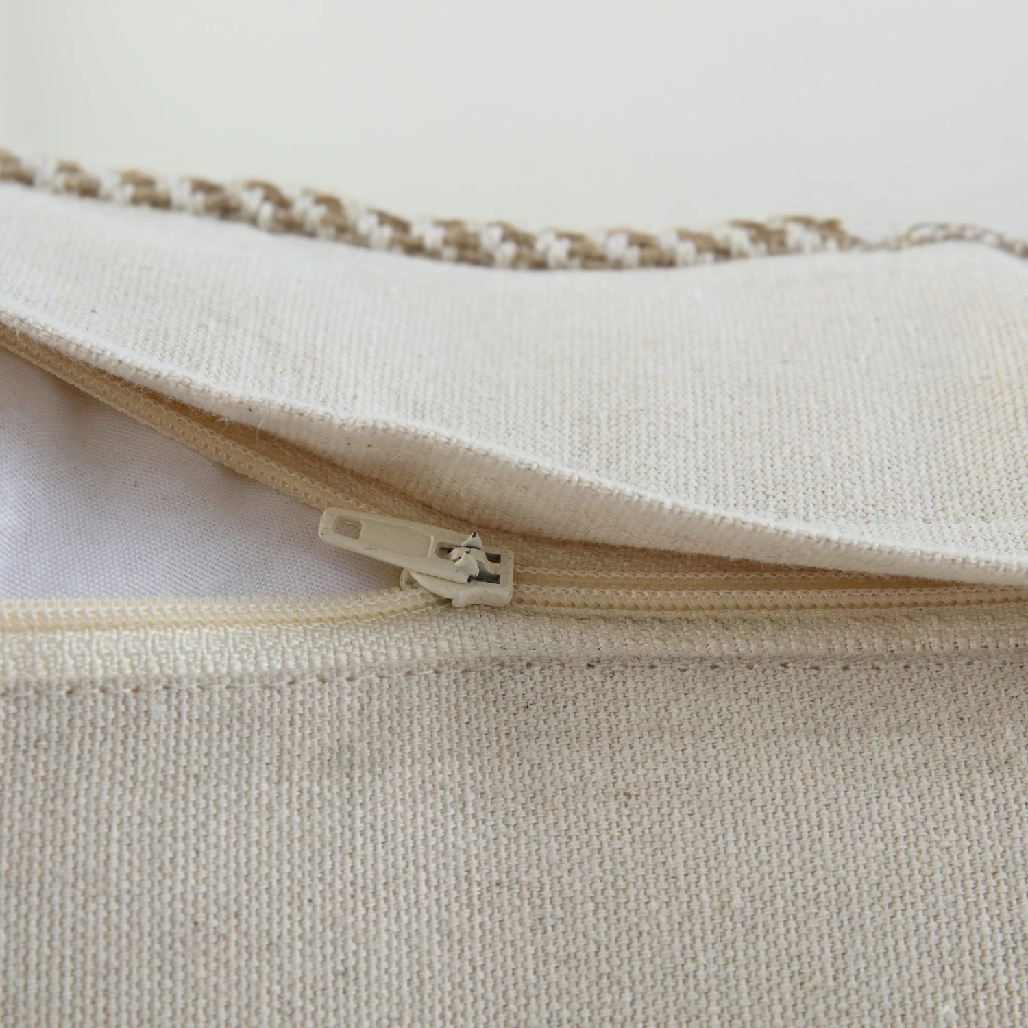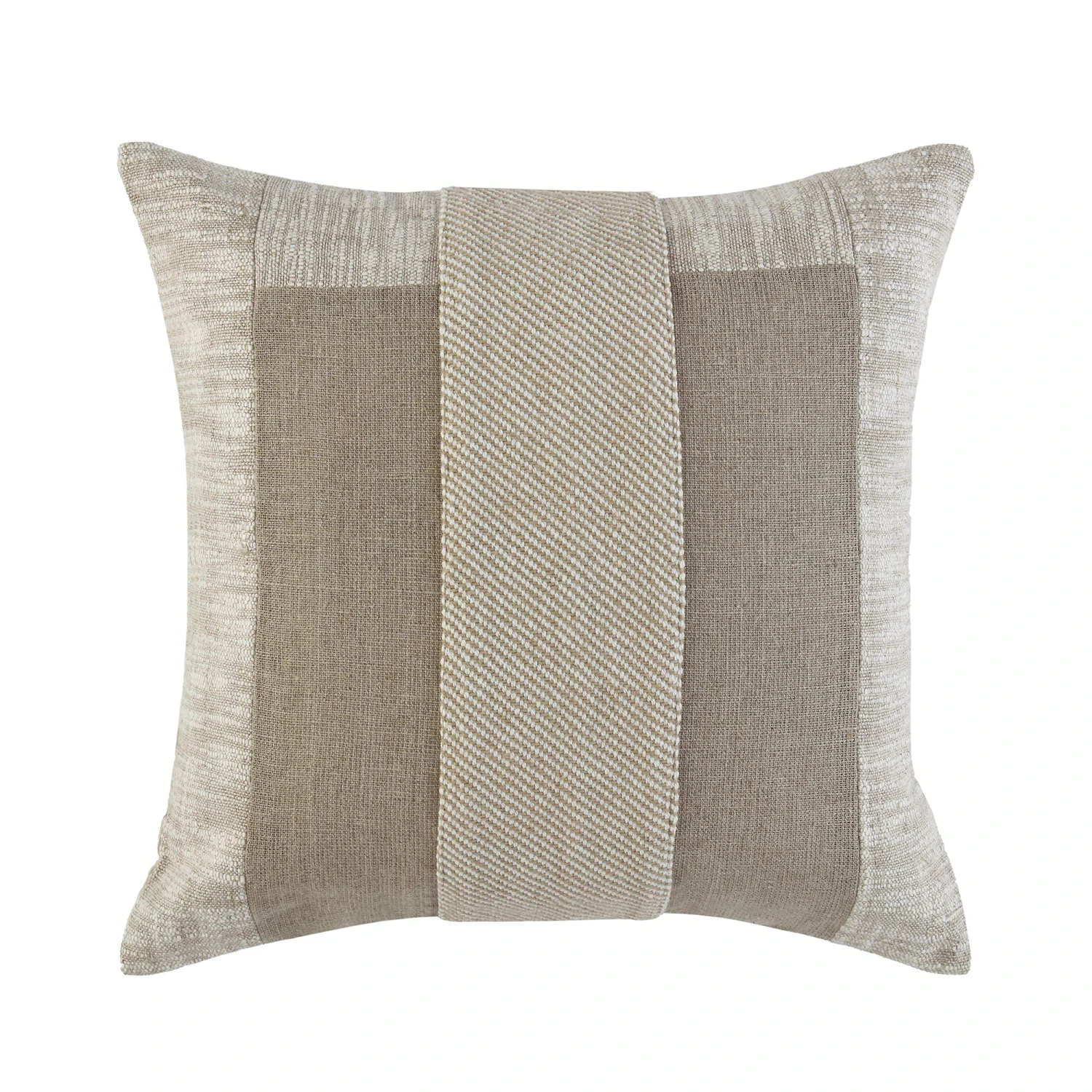This cushion features a meticulously crafted patchwork design, combining panels of premium cotton slub and woven silk slub. The visual appeal lies in the interplay of textures and the soothing palette of natural beige and oatmeal tones. With a matte cotton duck reverse, it offers a balanced look that complements various decor themes from minimalist modern to rustic chic.