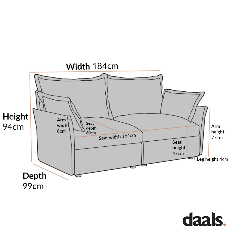 - 2-Seater sofa size: Wย 184 x D 99 x H 94 cm.