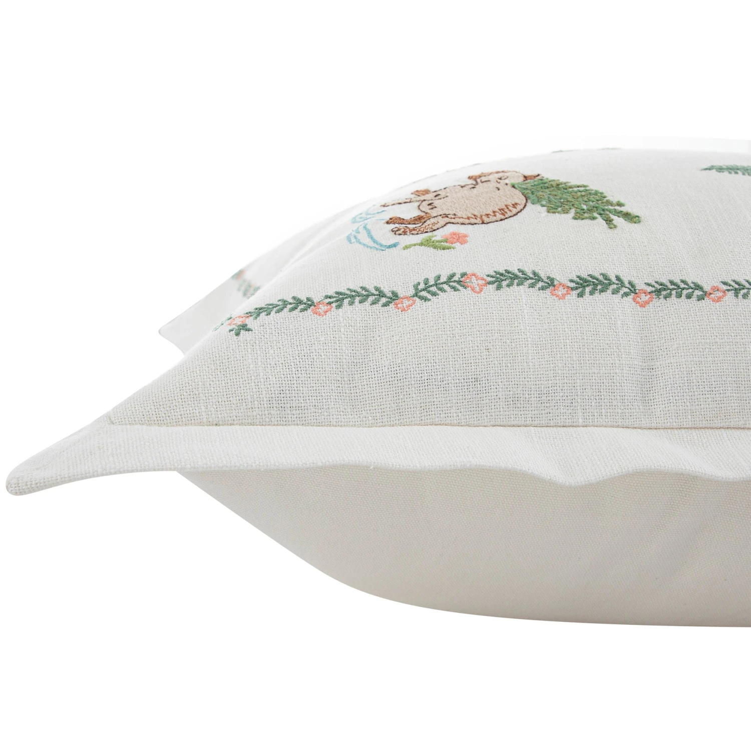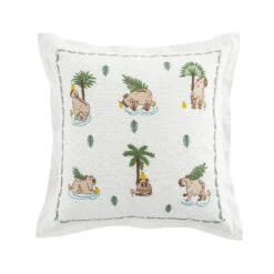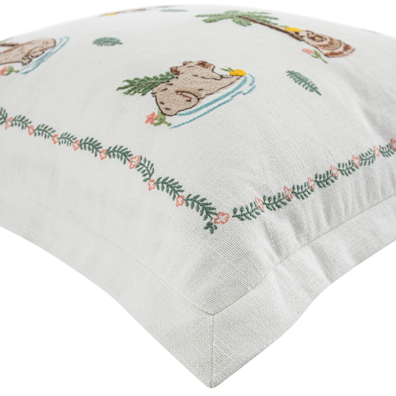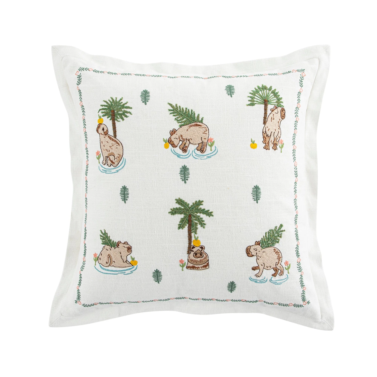 The design features six mellow capybaras floating through a dreamy scene of lush palm leaves, delicate flowers, and vibrant yuzu fruits. Every detail is meticulously hand-embroidered across a textured white cotton-slub base, showcasing natural knots and bumps that add character. The palette of soft oranges, gentle pinks, and leafy greens is framed by a delicate floral border and finished with a stylish flange edge for a touch of extra sophistication.