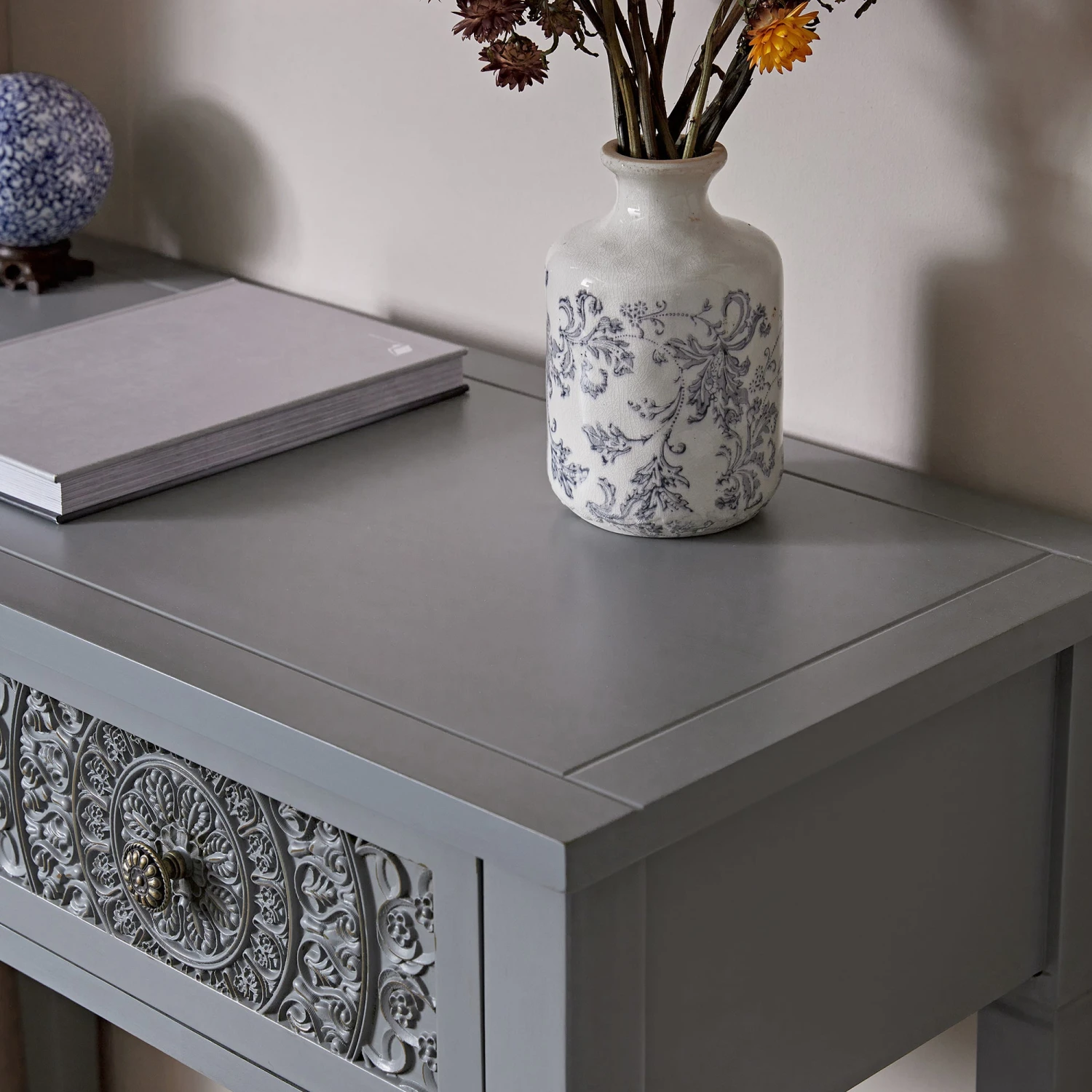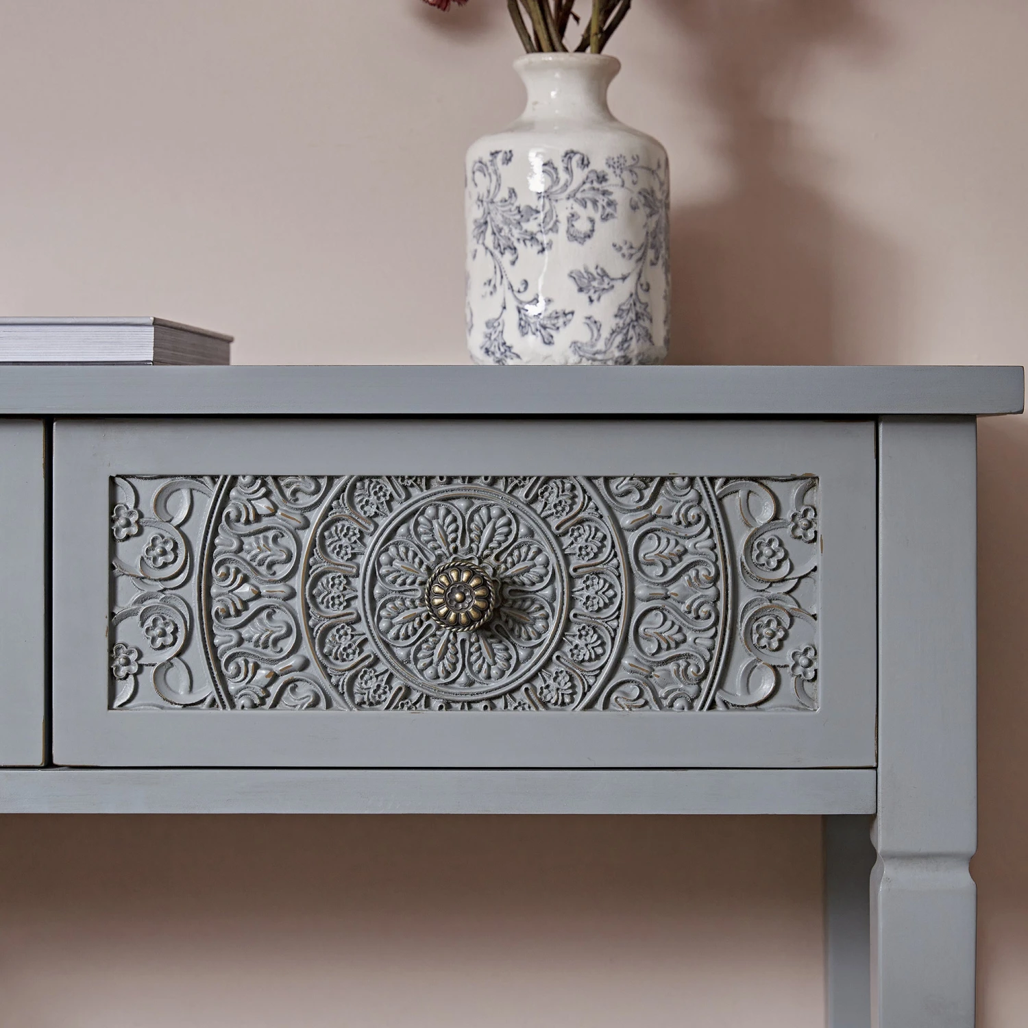 - The carved floral drawers take centre stage, set against a softly muted grey with blue undertones.