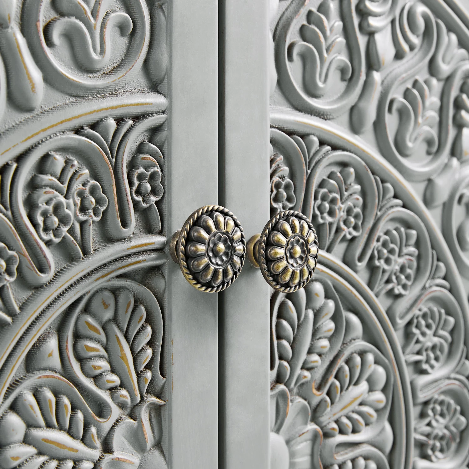 - Carved door fronts form a striking mandala motif, while the mid-grey finish and gently distressed edges offer a calm, sophisticated palette that works beautifully across modern rustic, classic, or neutral interiors.