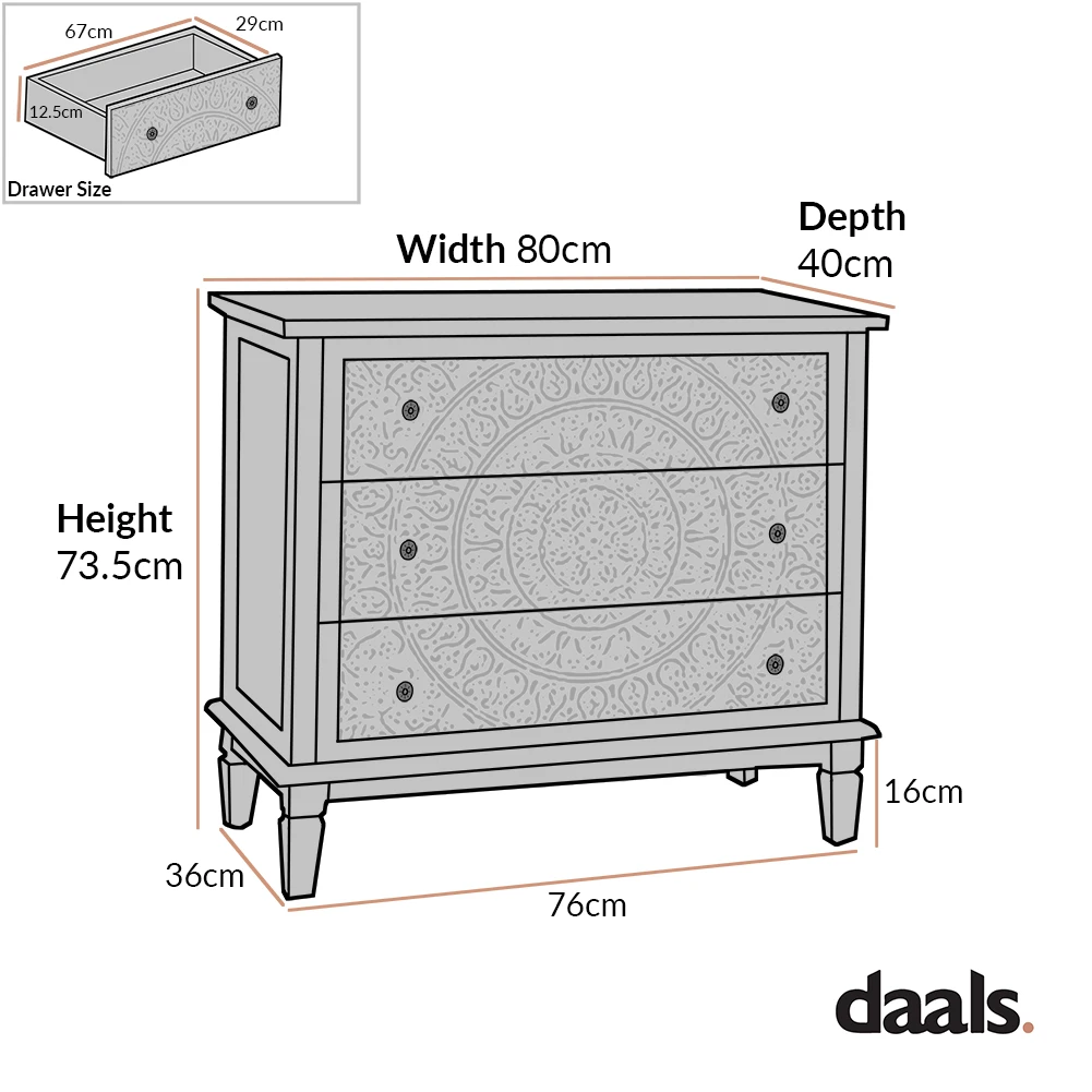 - Lending a touch of “greige” charm into your bedroom, our Chantilly chest of 3 drawers features whitewashed finish wooden surfaces without covering any natural grain.