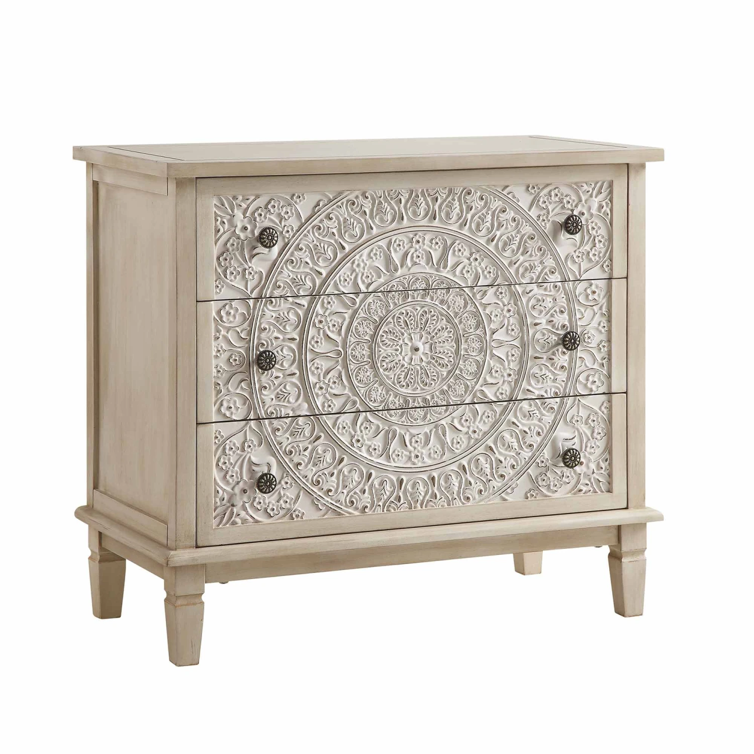 - Complete the look:ย Pictured with our Chantilly Whitewashed Carved 3-Drawer Chest is our Ophelia Ecru Boucle Chair