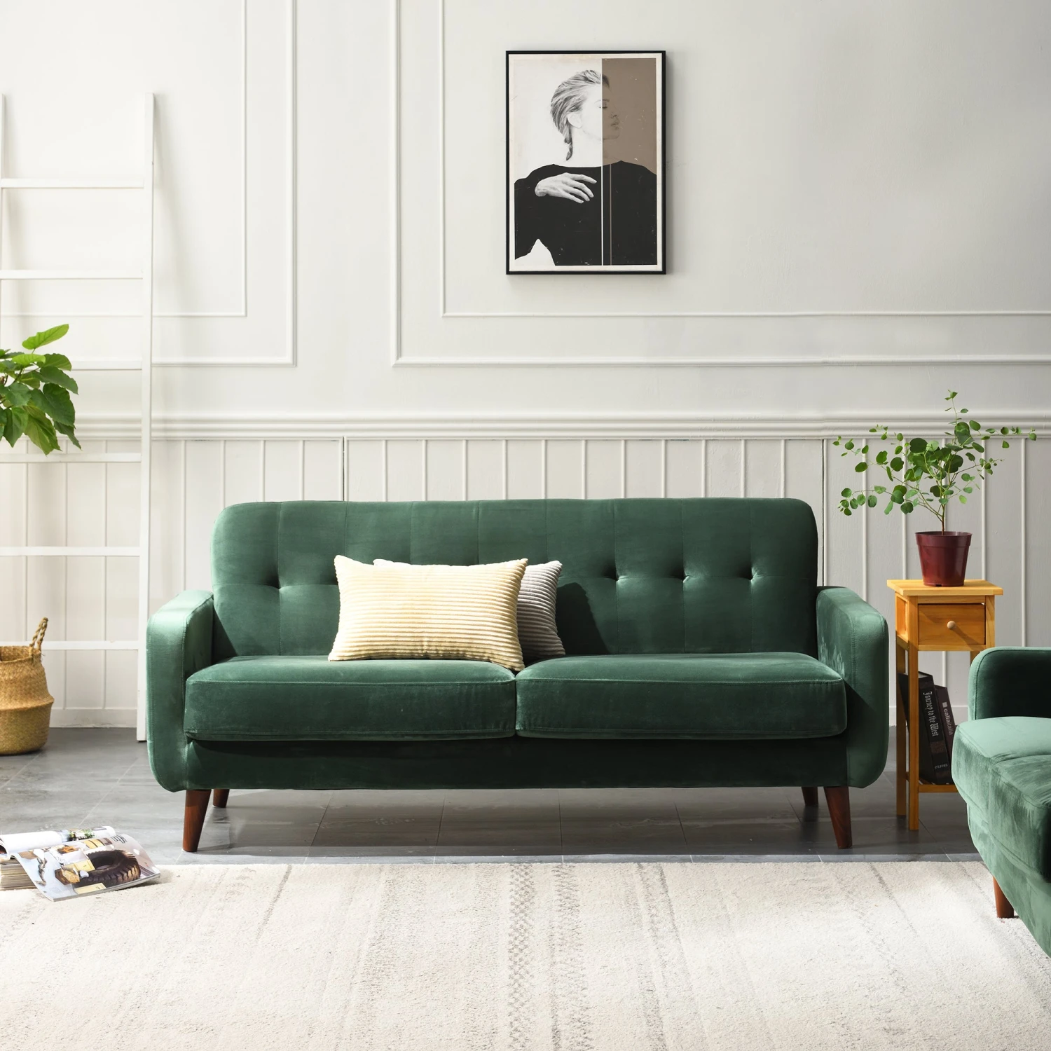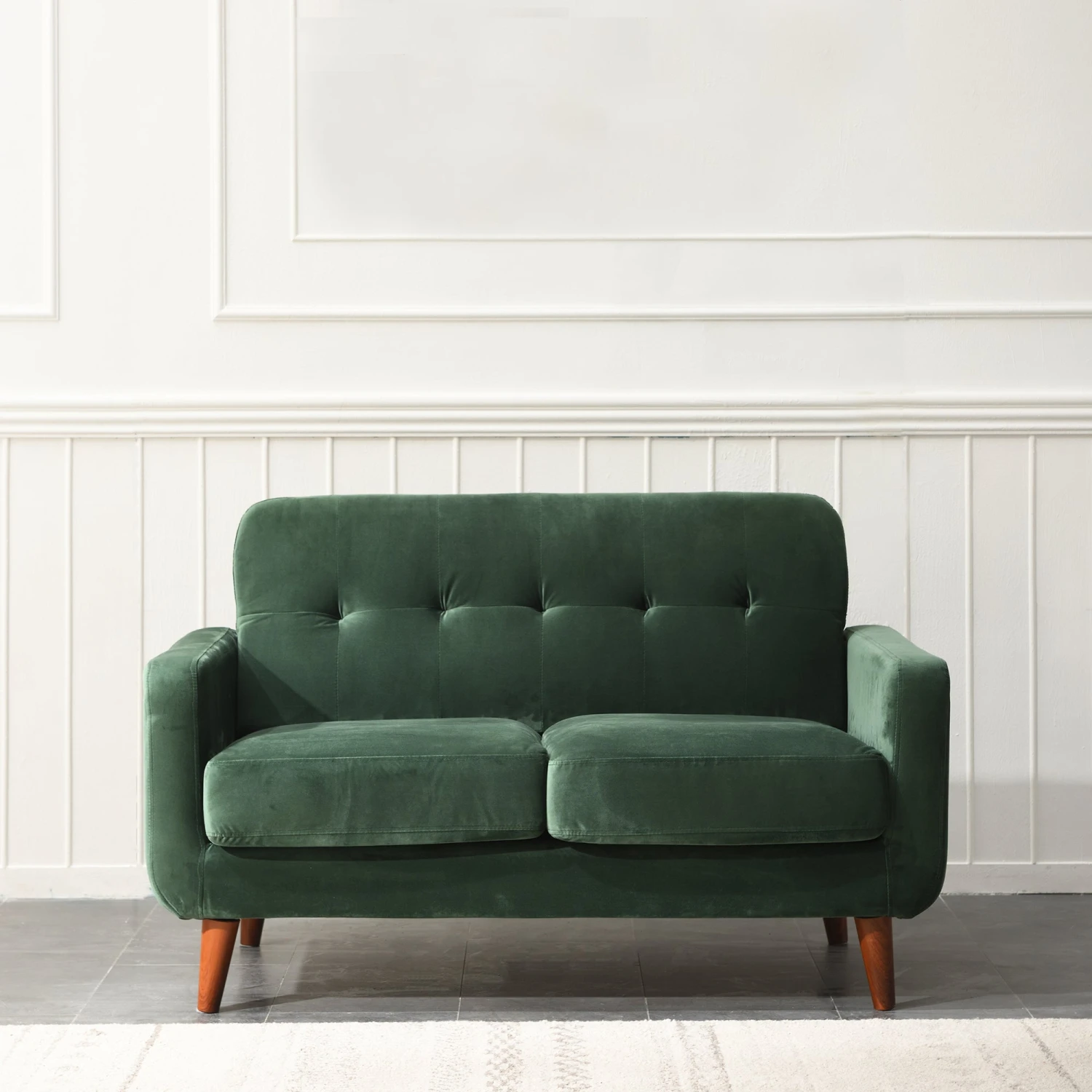 - Upholstered with soft velvet effect fabric in beautiful colours, the sofa comes with tufted backrest and sits on tapered legs. The well proportioned backrest and thick seat cushions offer a comfortable and supportive sitting experience.