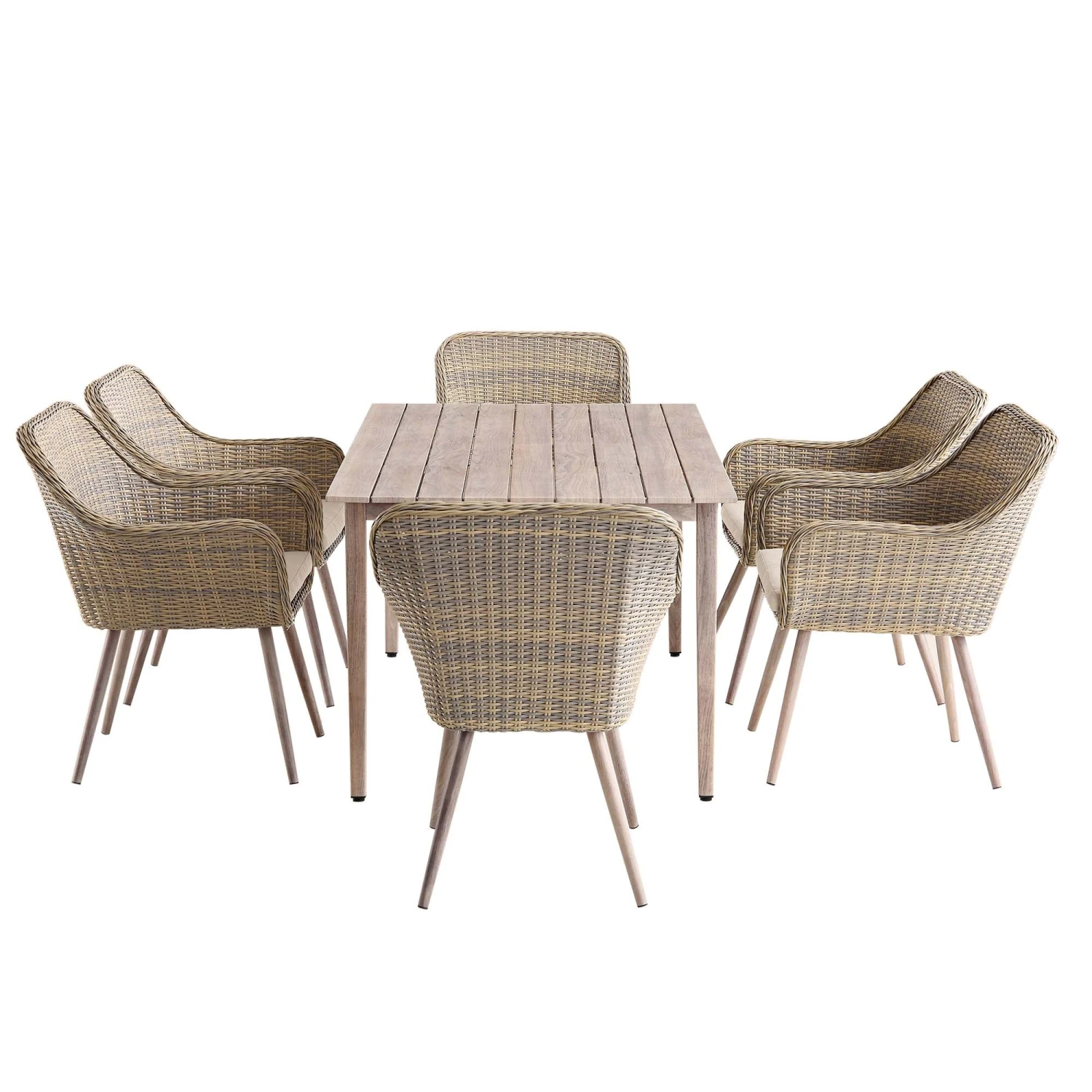 - Comprising of a sturdy aluminium frame toย resemble the beauty of the slight washed natural wood, paired with rattan dining chairs with sumptuous seat cushions, ourย Clivedenย Diningย set is perfect for adding some country style to your outdoors.