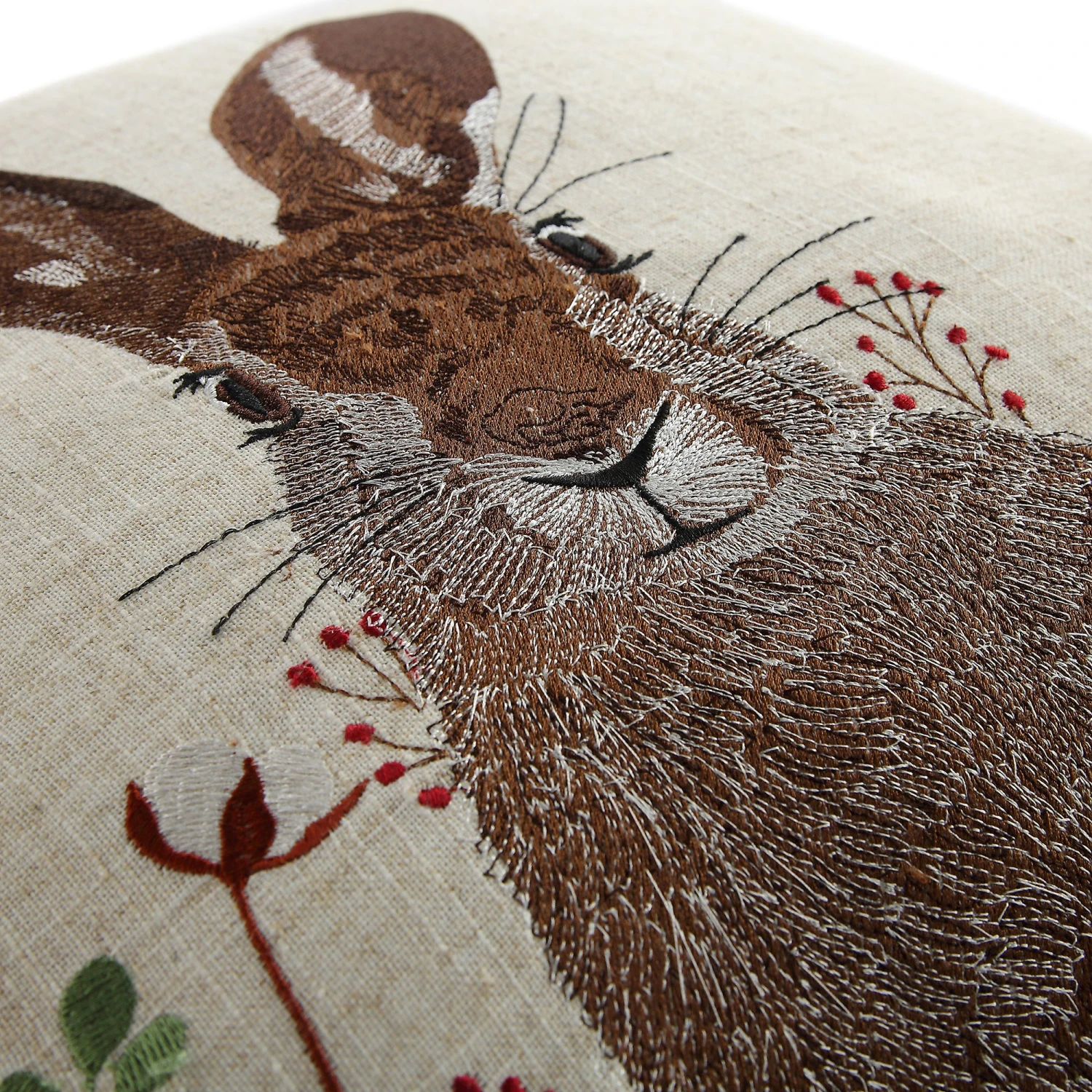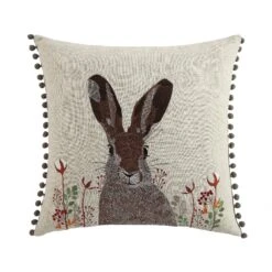 Bring the rustic charm of the British countryside into your home with this exquisite embroidered hare cushion.