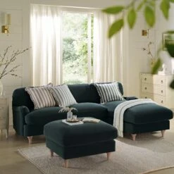 - Complete the look:ย Pictured with our Daphnis Aegean Blue Velvet Right Hand Grand Chaise is our Aurora Hand Braided Cream Jute Rug, our Thalia Concave Chest of Drawers in Washed White and our Edith Reversible Linen Blend Frilled Cushions