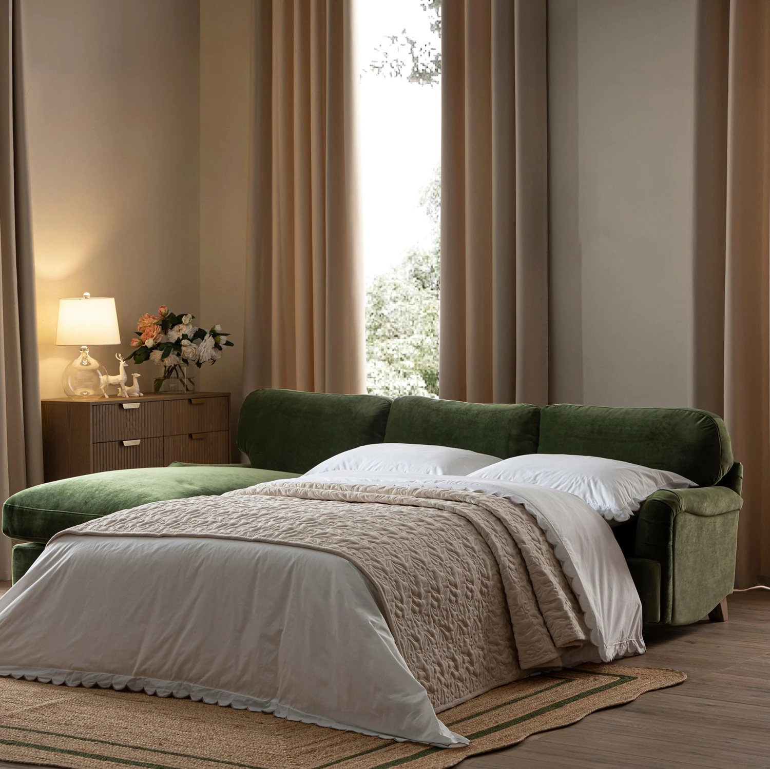 - Complete the look: Pictured with the Daphnis Fern Green Velvet Grande Chaise Sofa Bed is our Evie Hand Braided Jute Scallop Green Border Rectangular Rug and Richmond Dark Ash Ridged 2-Door Cabinet.