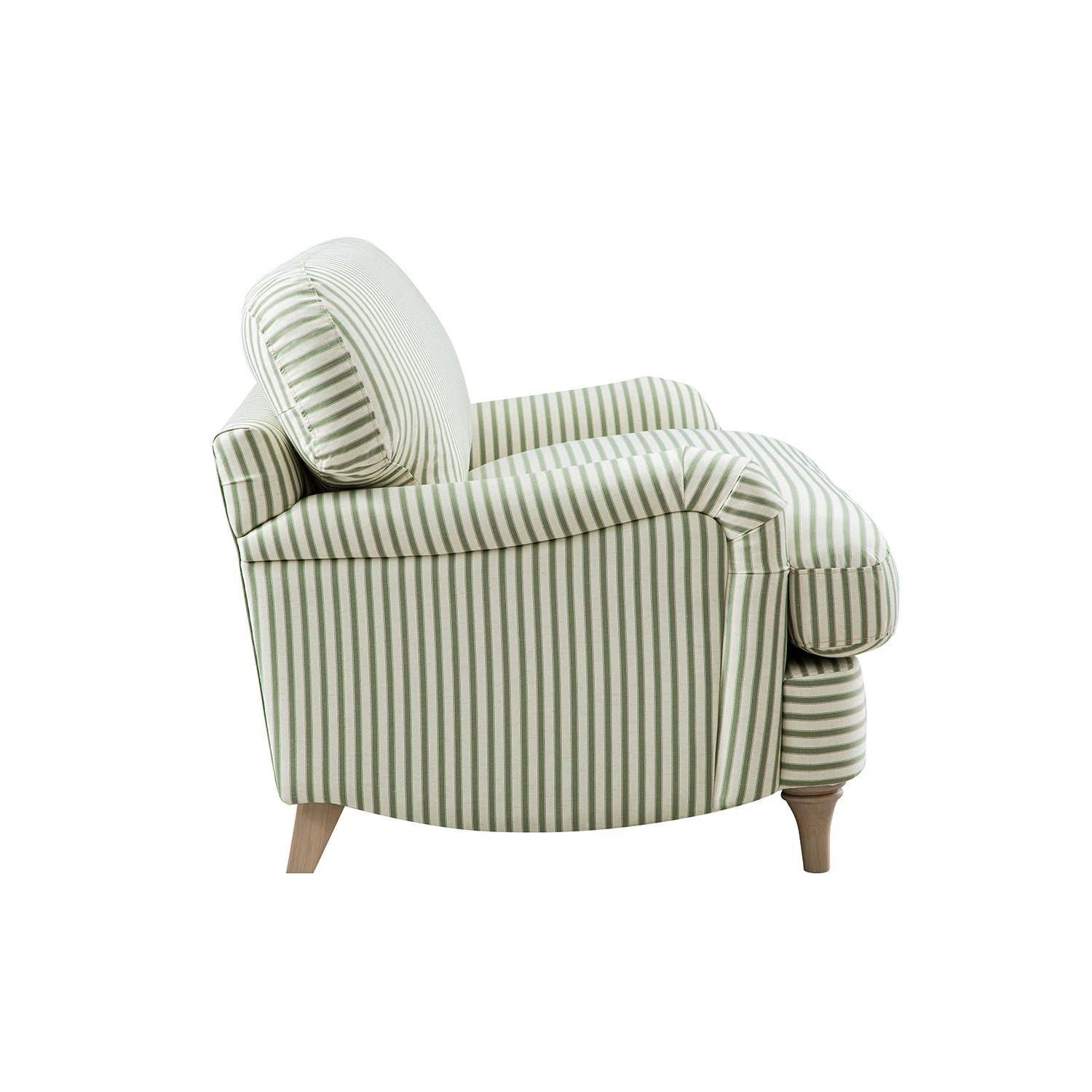 - Upholstered in a soft linen blend fabric with green and beige tickling stripes, it brings a calming, nature-inspired look that complements both modern and traditional interiors.