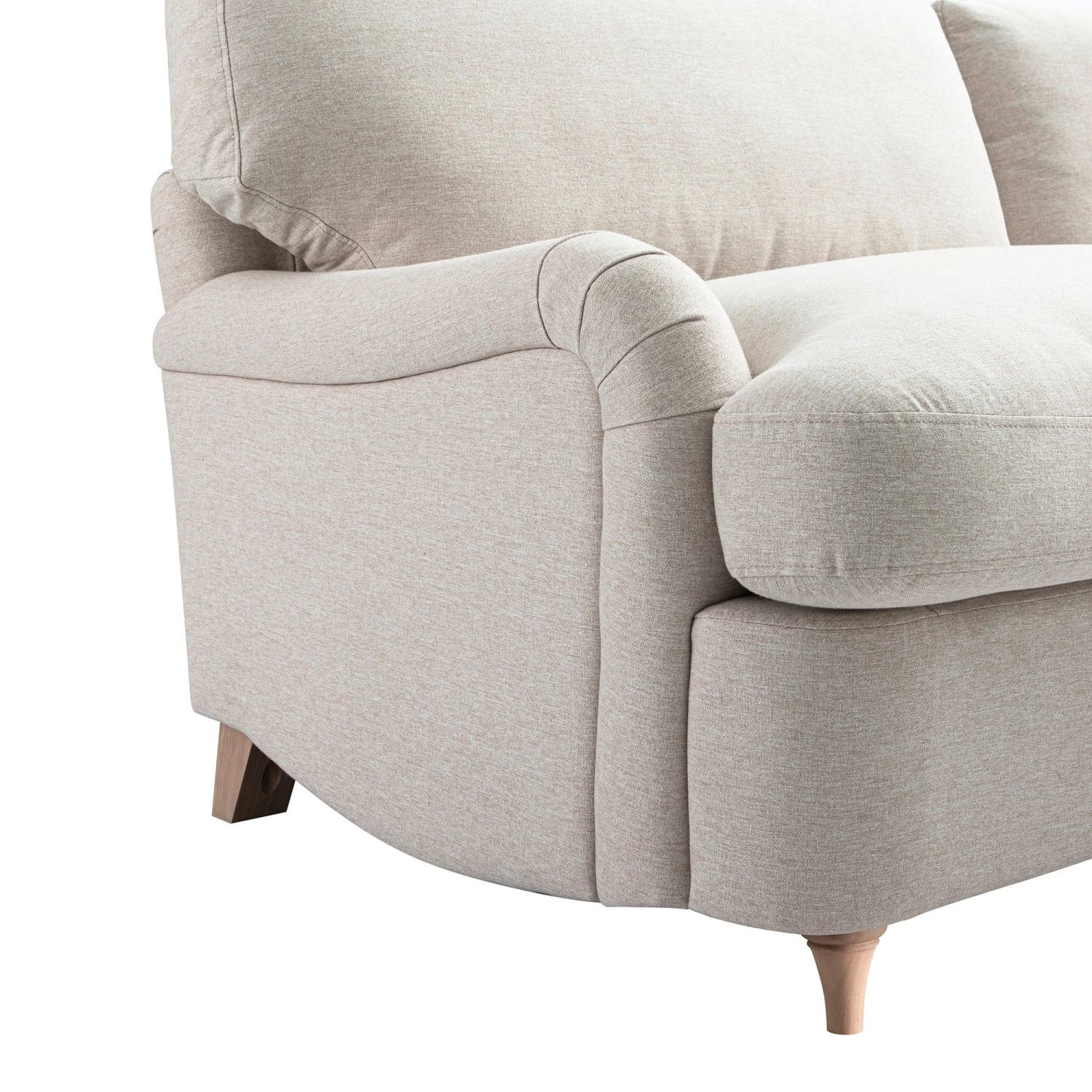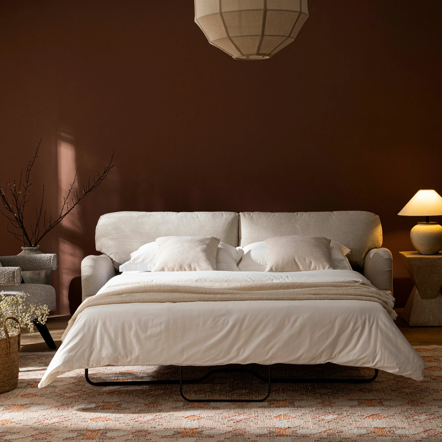 - Complete the look:ย Pictured with the Daphnis Oatmeal Fabric Sofa Bed, Large 3-Seater, is our Chinnor Taupe Boucle Black Oak Frame Accent Chair, Ikat Collection Lunar Grey Hand Embroidered Cushion, and our Yasmin Kilim Pink Handwoven Wool & Jute Rug.