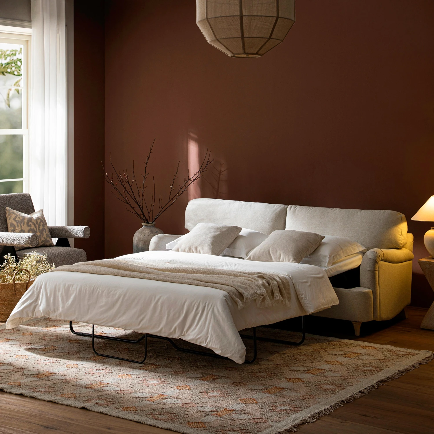 - Inspired by the quintessential traditional English sofa, our Daphnis large three seater sofa bed offers a perfect place for three or more people to sink in, with added functionality of transforming into a comfortable bed with single mattress.