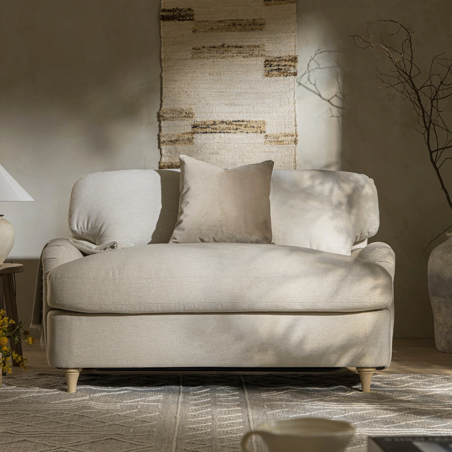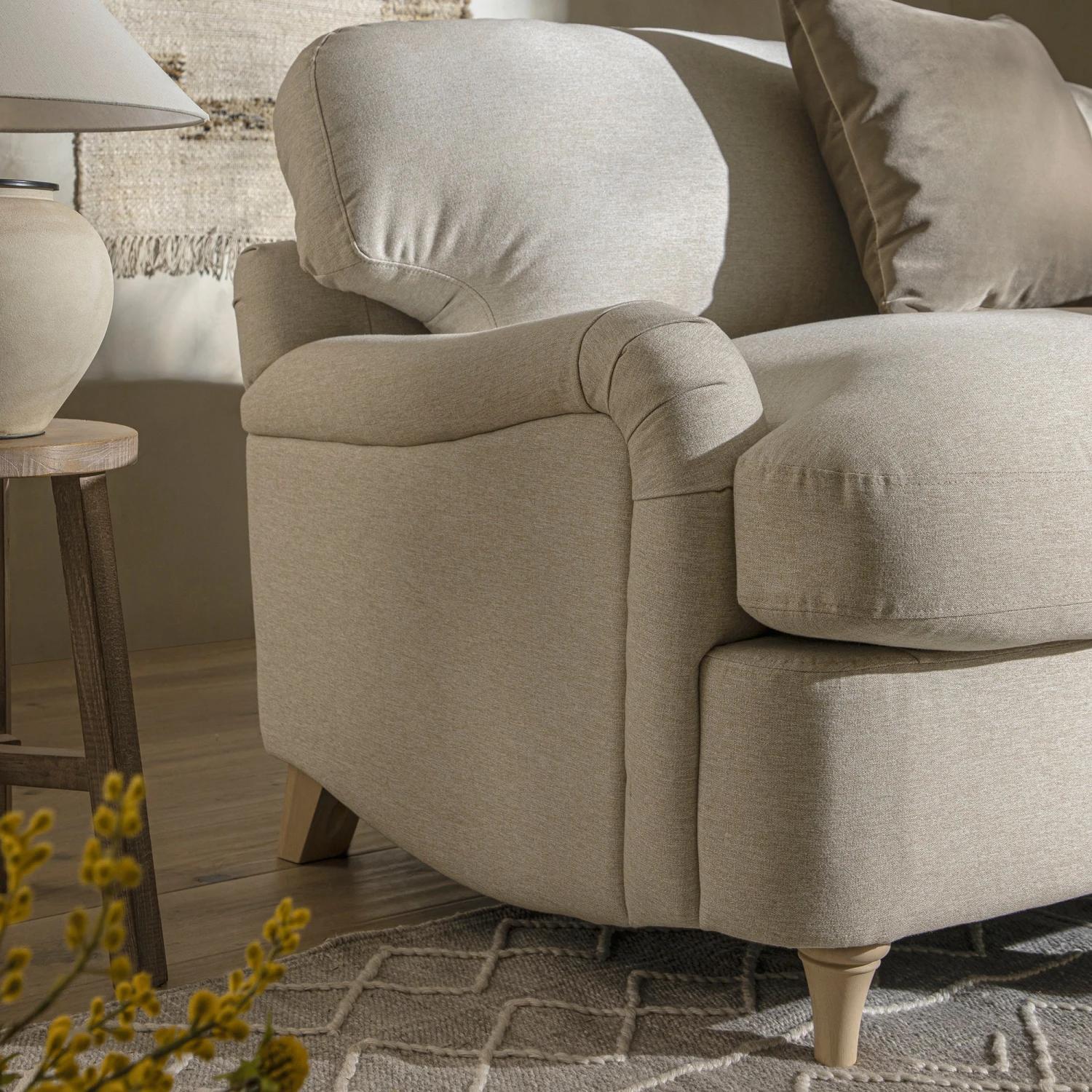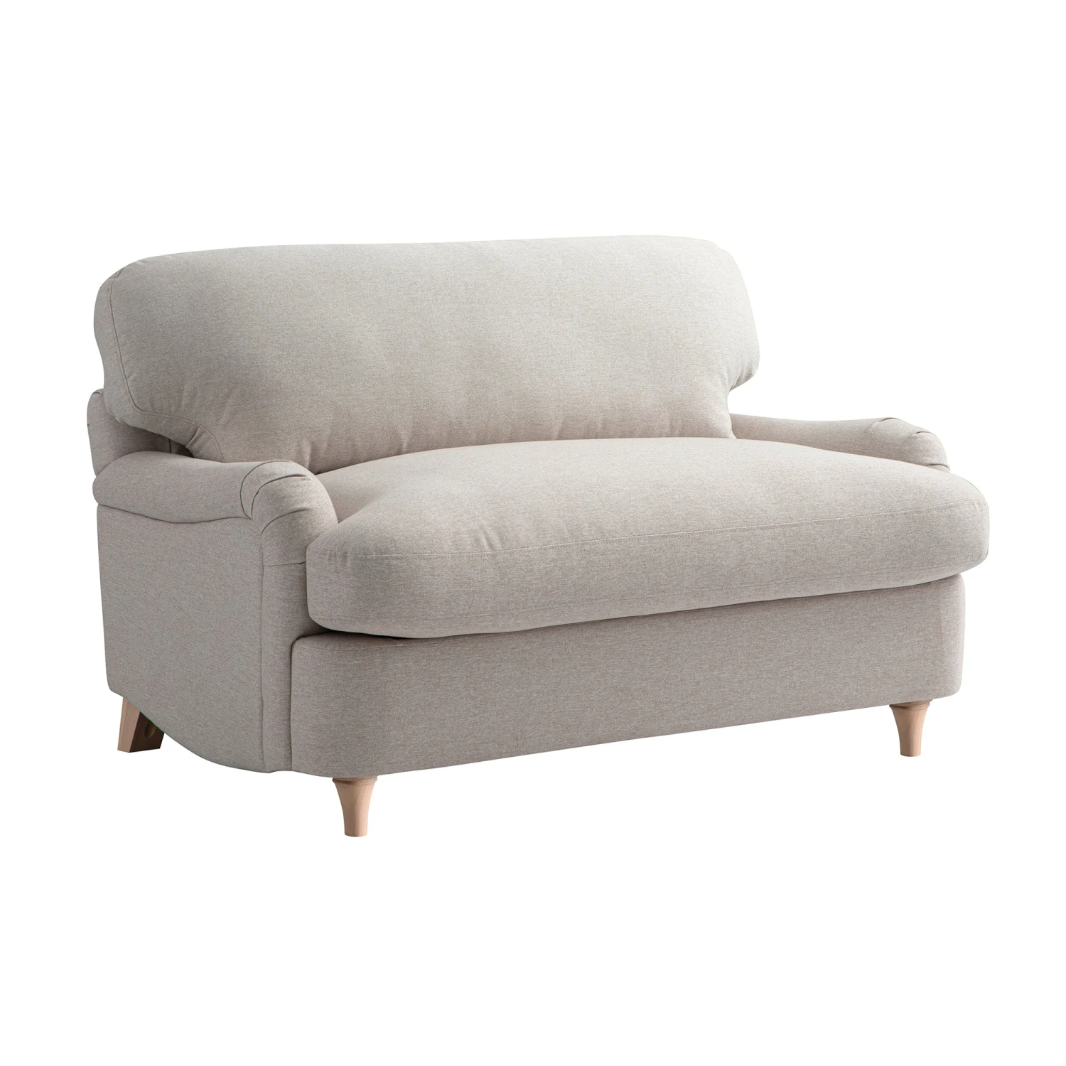 - Upholstered in cosy oatmeal brushed fabric that blends in nicely with any decor
