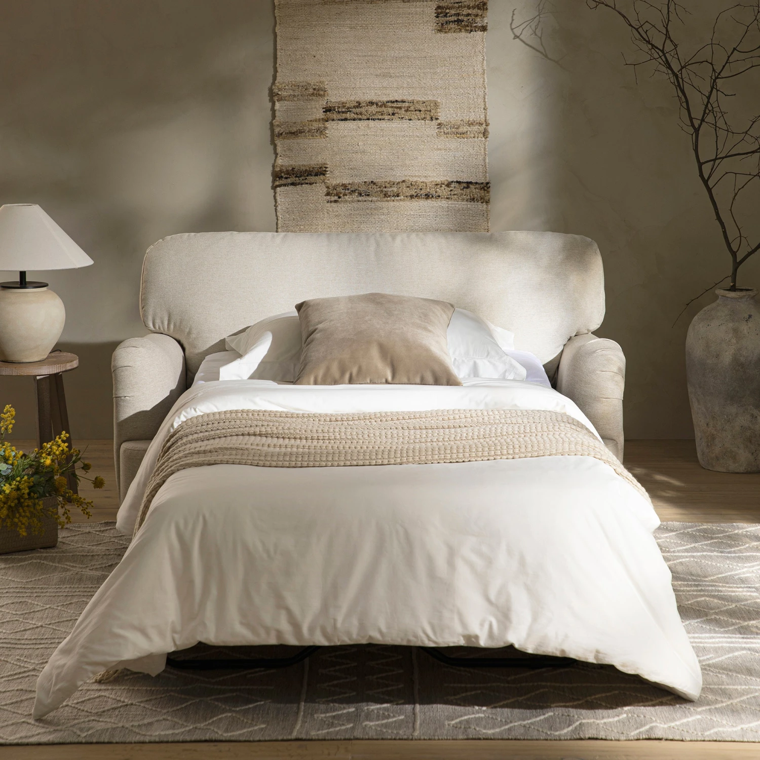 - Complete the look: Pictured with the Daphnis Oatmeal Fabric Loveseat Sofa Bed is our Nyla Aztec Indoor Outdoor Handwoven Steel Grey Rug.