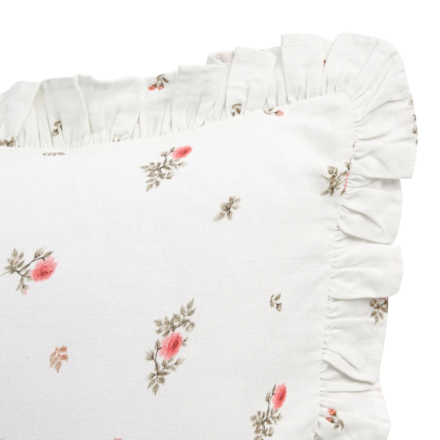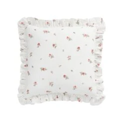 Transform your living space into a romantic sanctuary with the Darcy Rose Ruffle Cushion. Combining vintage charm with artisan craftsmanship, this piece is designed to bring a soft, traditional aesthetic to bedrooms and lounges alike. This cushion features a crisp ivory white linen-blend base adorned with a delicate pink rose print. The centerpiece consists of intricate hand-embroidered roses that mimic the texture and feel of heritage antique fabrics. Framing the design is a voluminous ruffled border that adds a playful, feminine energy and romantic depth to its silhouette.