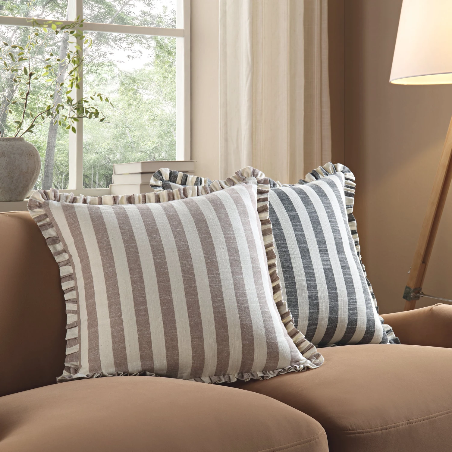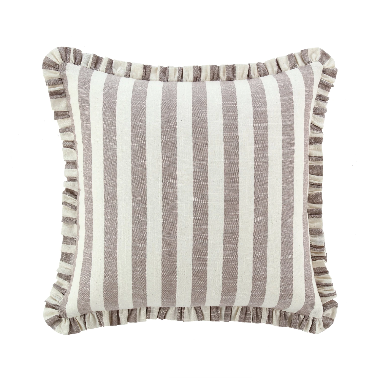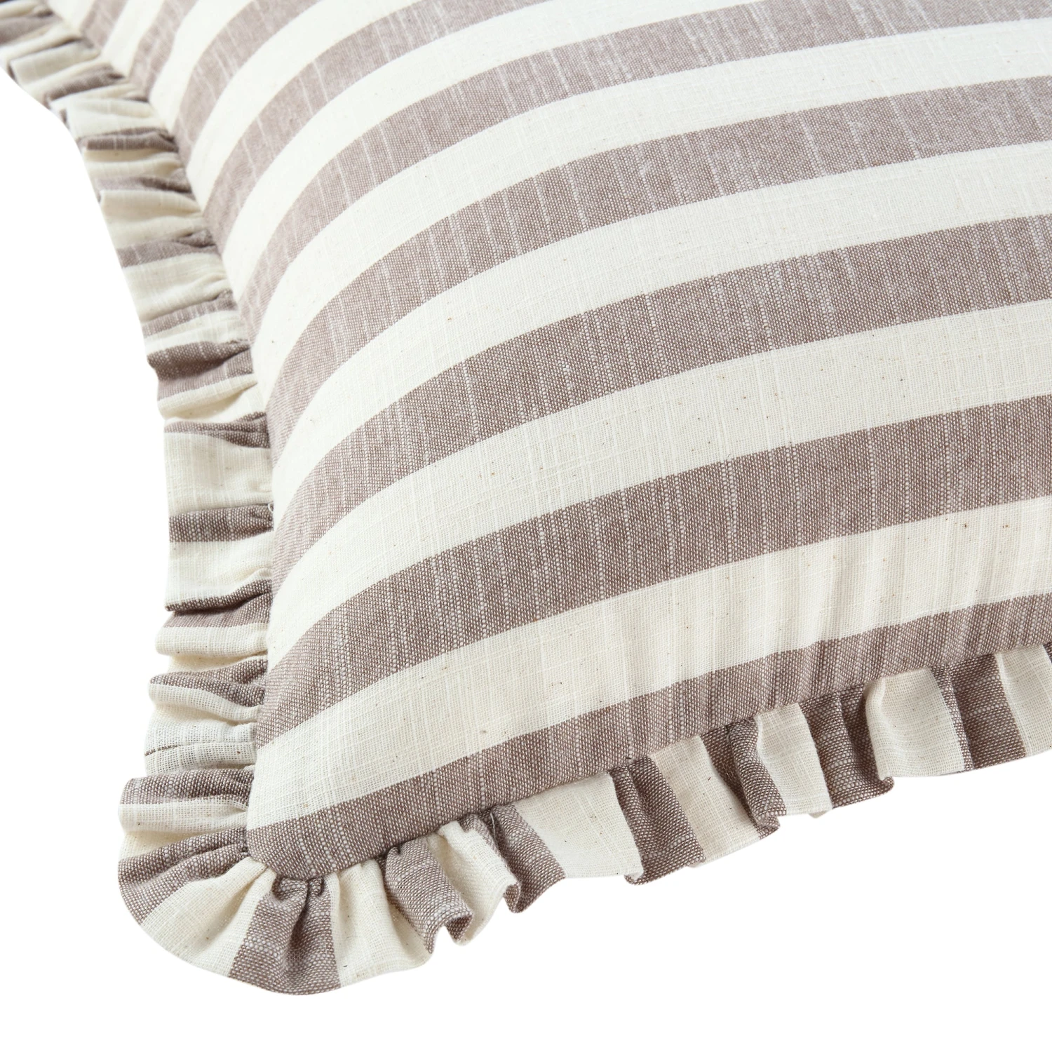 This exquisite cushion features a dual-sided design tailored for the modern aesthetic. One side showcases a classic beige striped pattern, which can be styled horizontally or vertically to create visual interest. The reverse side transitions to a minimalist, plain natural linen fabric, ensuring this piece complements any interior palette. Both sides are beautifully framed by a matching ruffled stripe edge, providing a soft, cottage-core inspired finish.