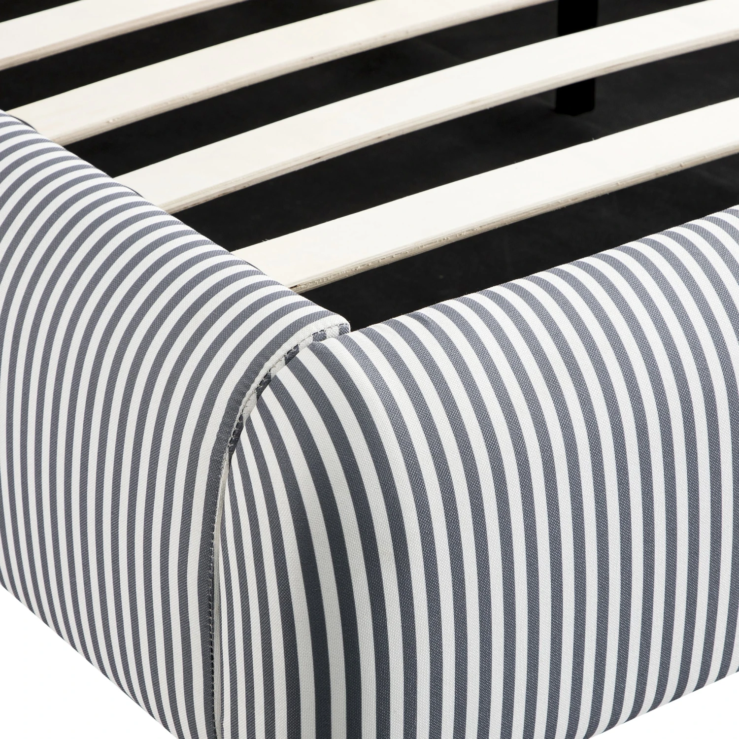 - Our Egerie bed features inviting curved silhouette, upholstered in chic slate blue striped fabric for a fresh look