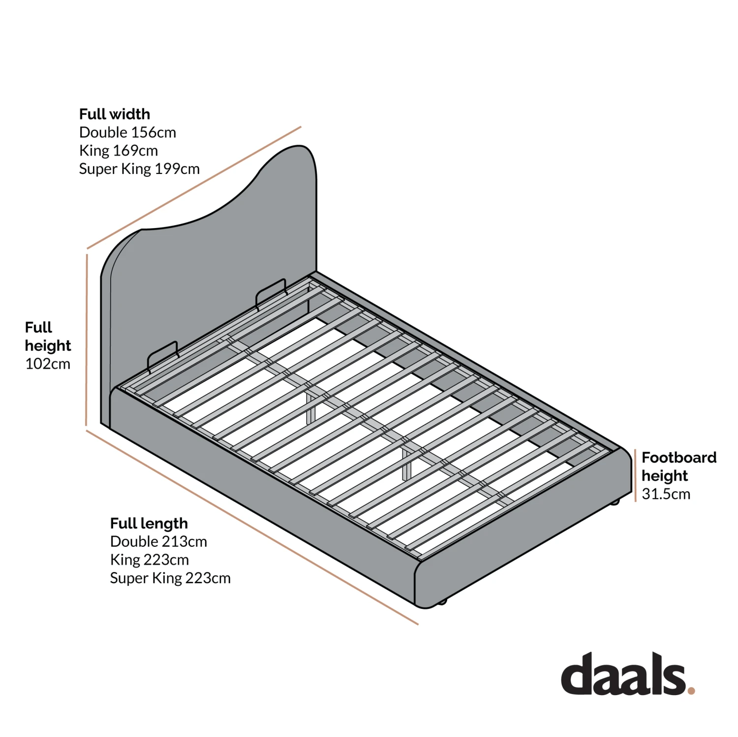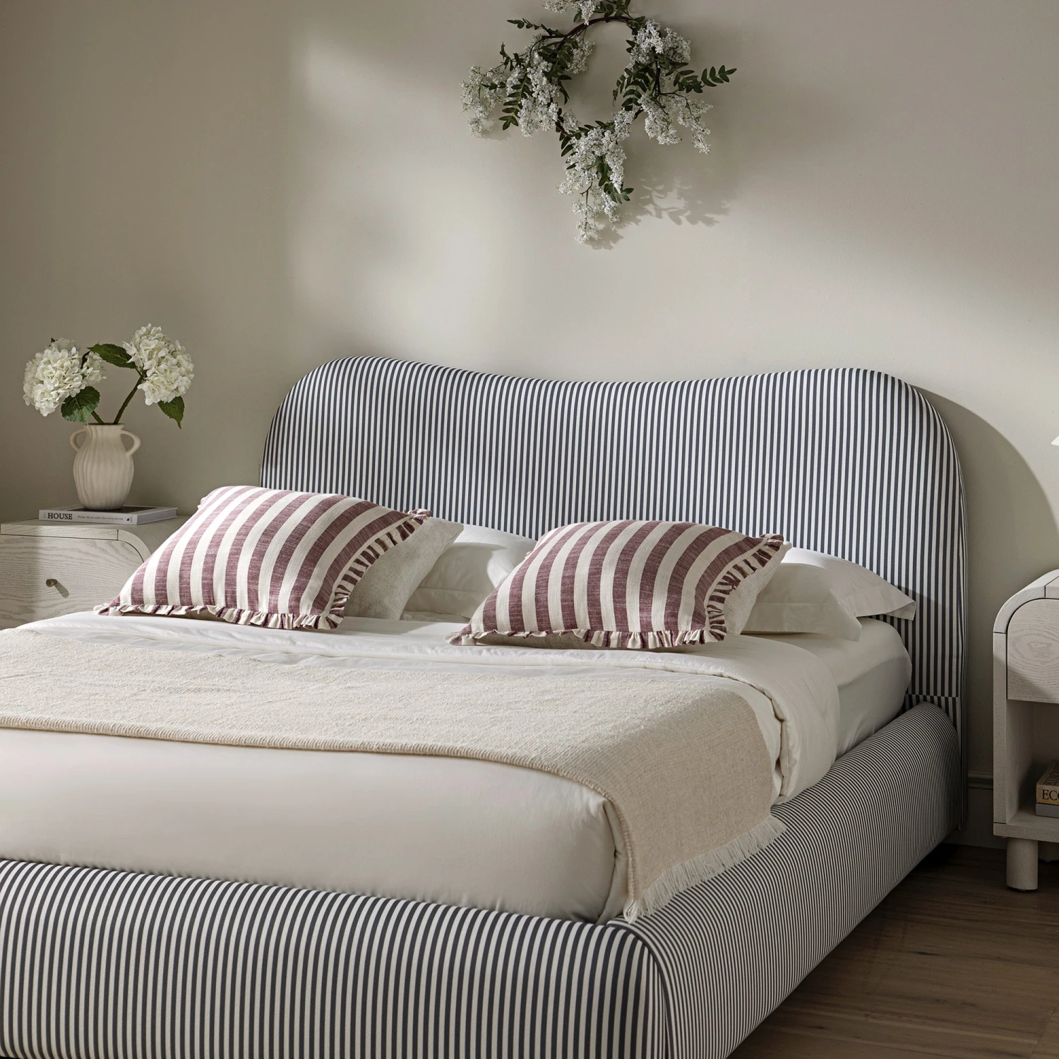 - Complete the look:ย Pictured with our Egerie Curved Headboard Slate Blue Striped Ottoman Bed is our Maude 1 Drawer Bedside Table, our Aurora Cream Hand Braided Jute Rug, Edith Reversible Linen Blend Cushions in Red, and our Kyra Stone Bouclรฉ Fringed Cushion.