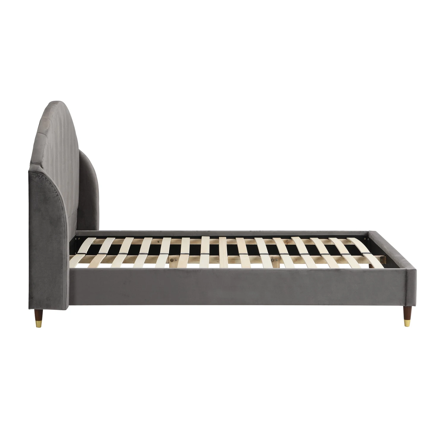 - Upholstered with opulent velvet look fabric, the bed is accented with golden colour tipped wooden legs for a sophisticated look.