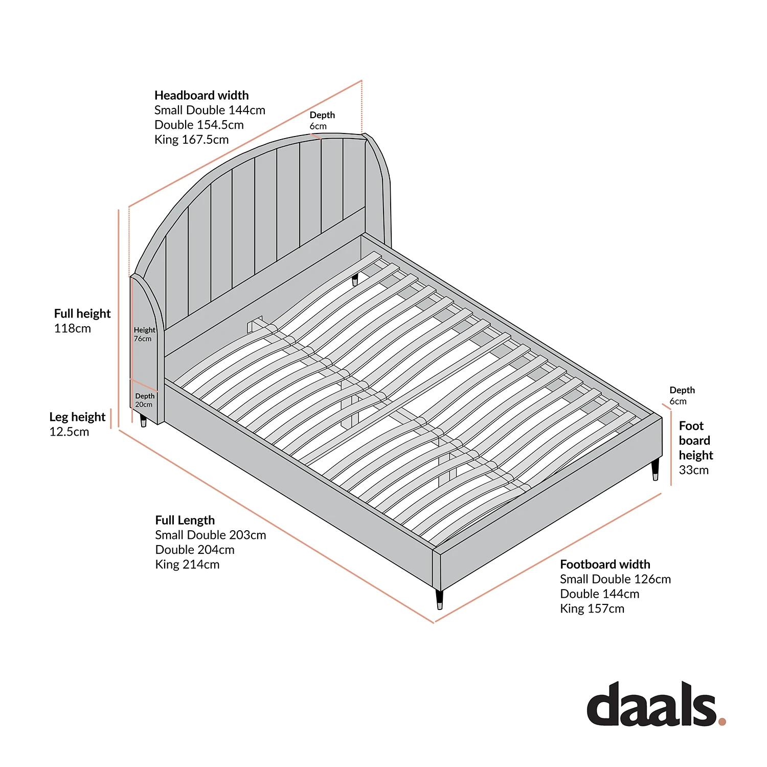 - Distance between slats: 7 cm (Double) / 7.75 cm (King).