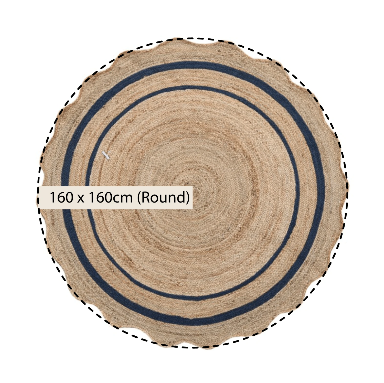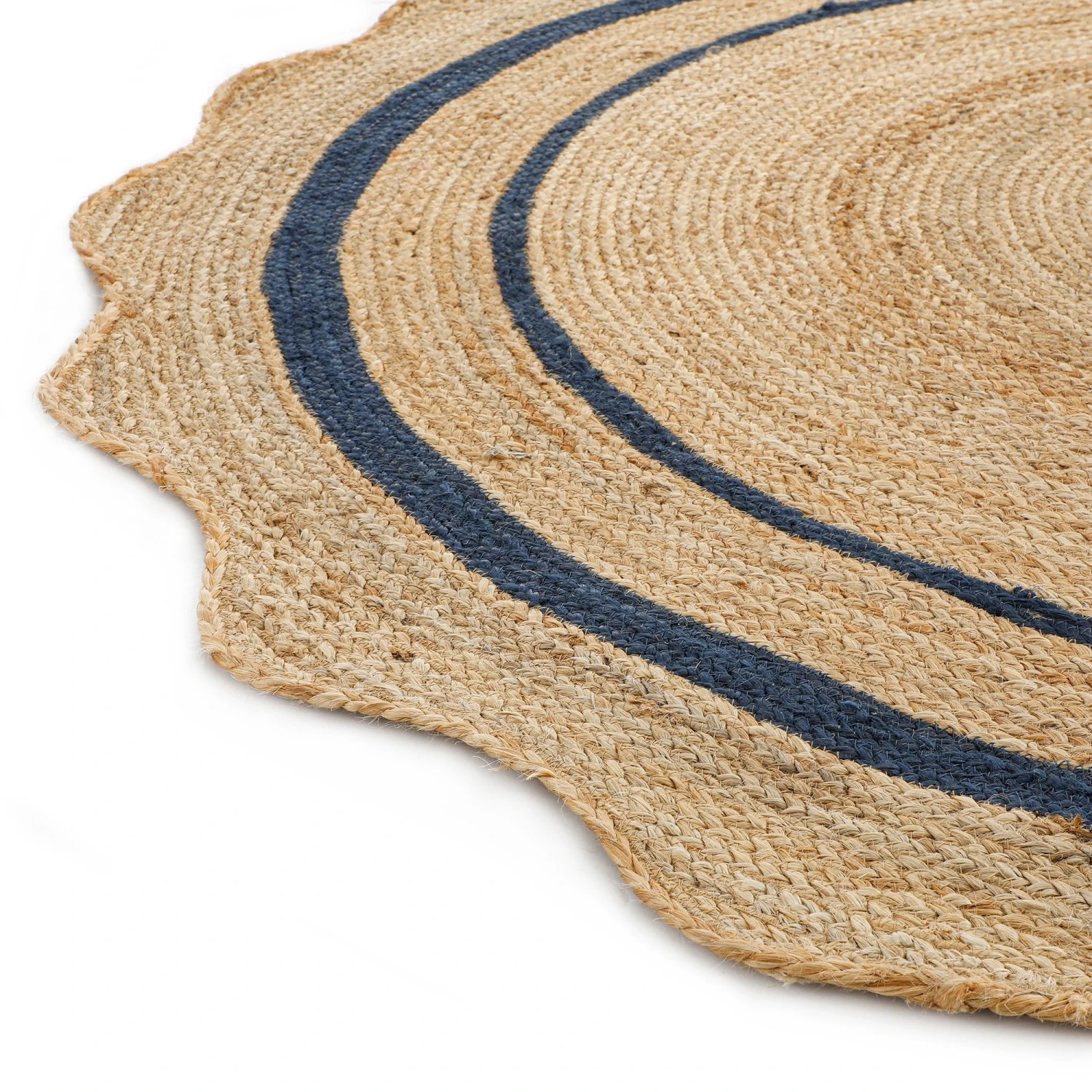 - Evieโs design incorporates a subtle spiral appearance towards the centre of the rug. This is then complemented by the classic scalloped edge and a deep navy blue double border to add contrast to the natural jute.