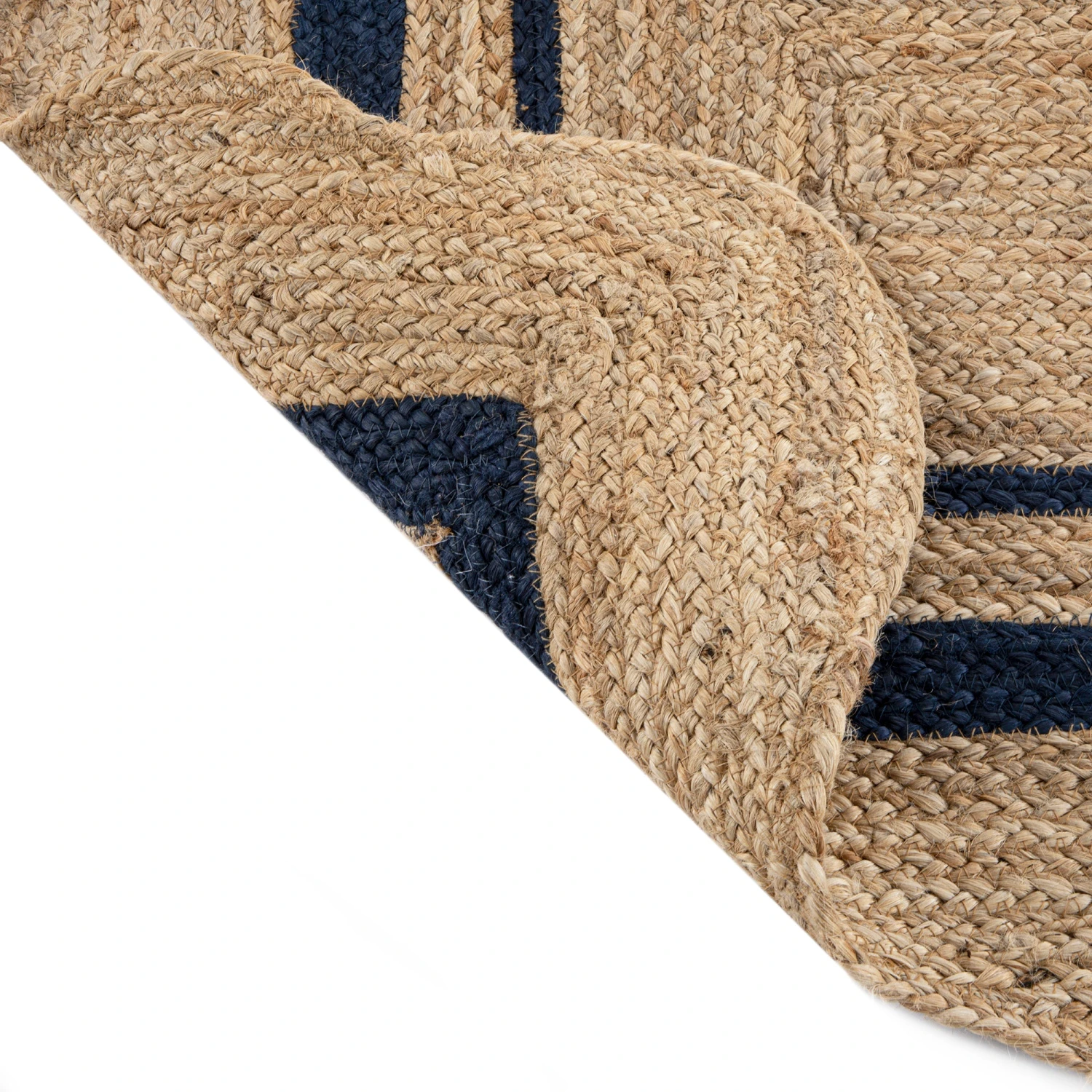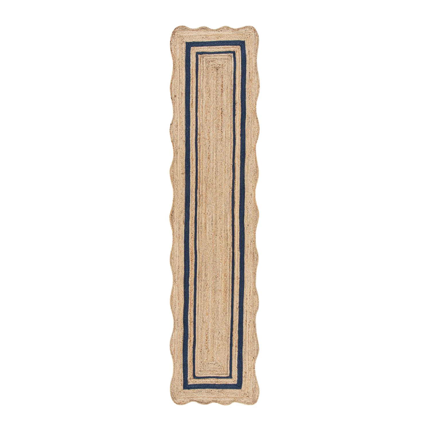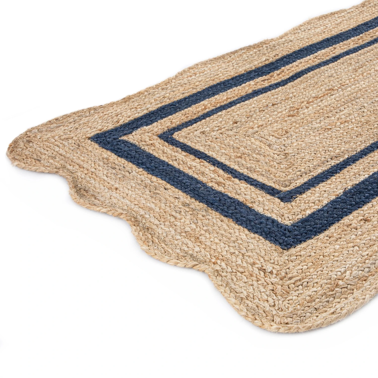 - Evieโs design is complemented by the classic scalloped edge and a deep navy blue double border to add contrast to the natural jute.