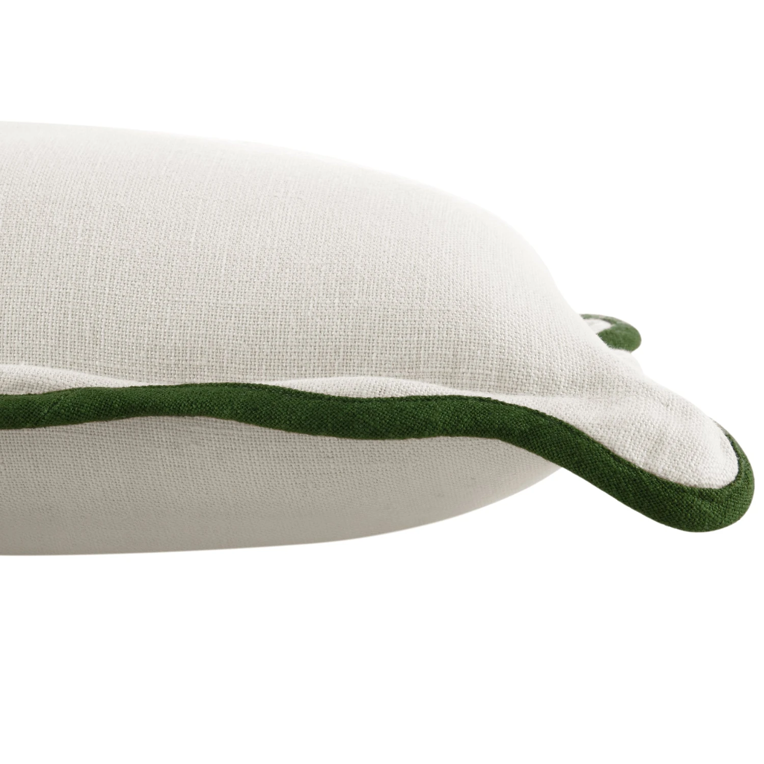 This cushion features a soft, neutral cream 100% natural linen base, beautifully framed by a bold, wave-like scalloped edge in a deep Cedar Green. The contrasting embroidery adds a refined texture and visual depth, making it a standout accessory for any sofa, armchair, or bedding arrangement.