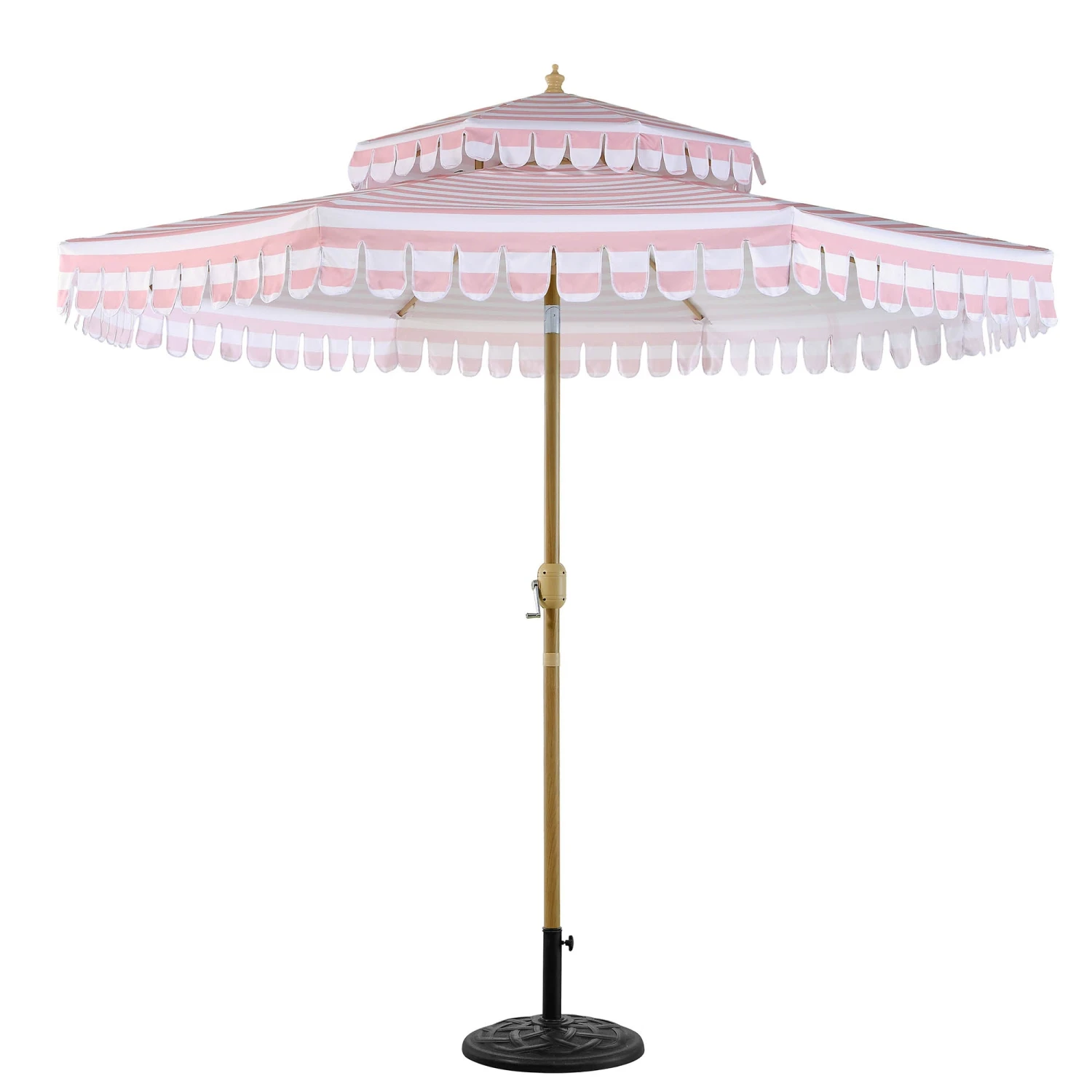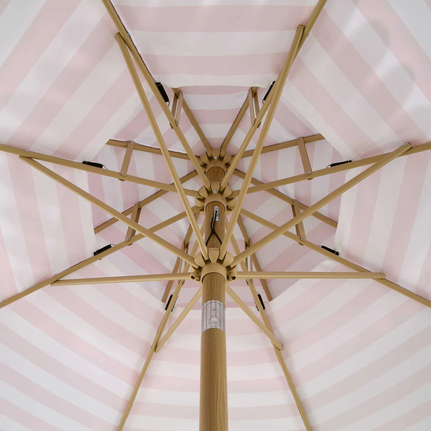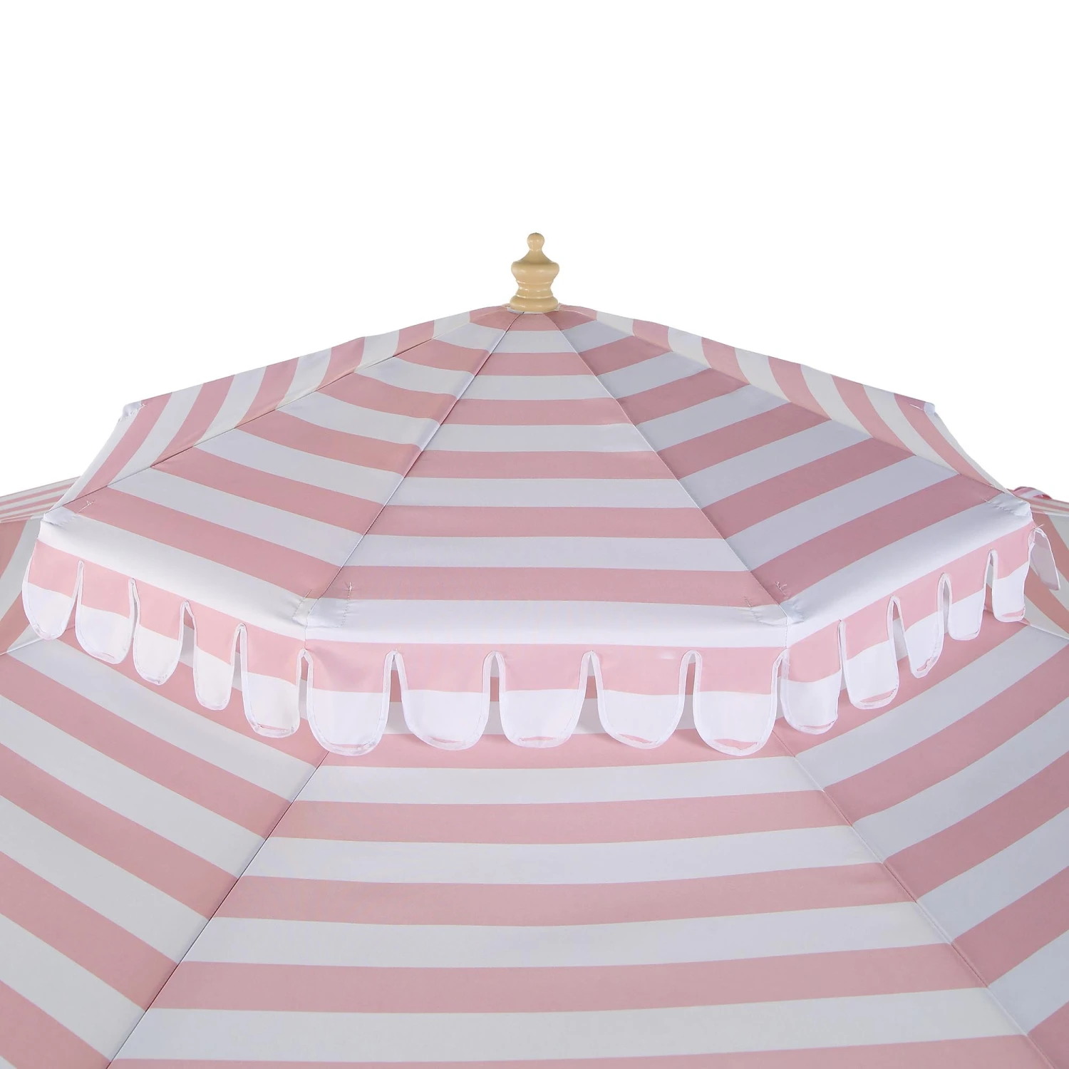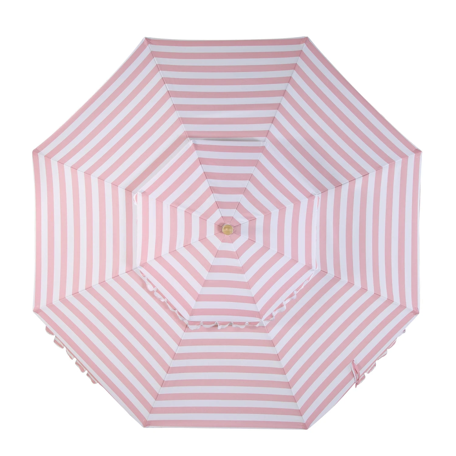 The Fabienne features a striking candy-pink and crisp white stripe pattern that delivers a timeless vintage look. To complete the aesthetic, the robust aluminum and zinc alloy pole is finished with a realistic wood-effect powder coating, offering the classic beauty of timber with the weather-resistant durability of modern metal.