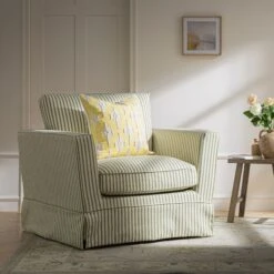 - A fresh interpretation of timeless comfort, the Fitz Skirted Armchair in sage stripe brings a refined yet inviting presence to any room.