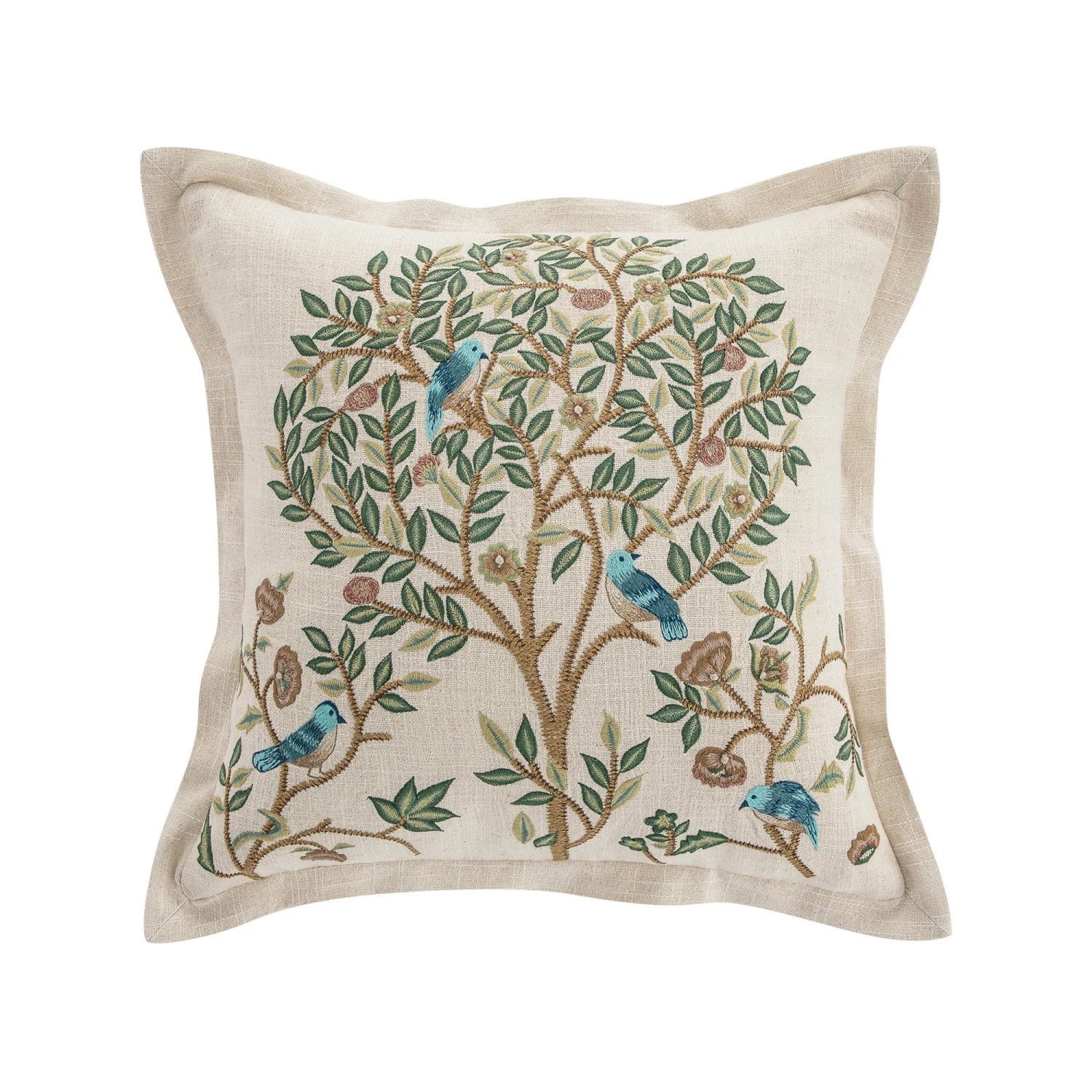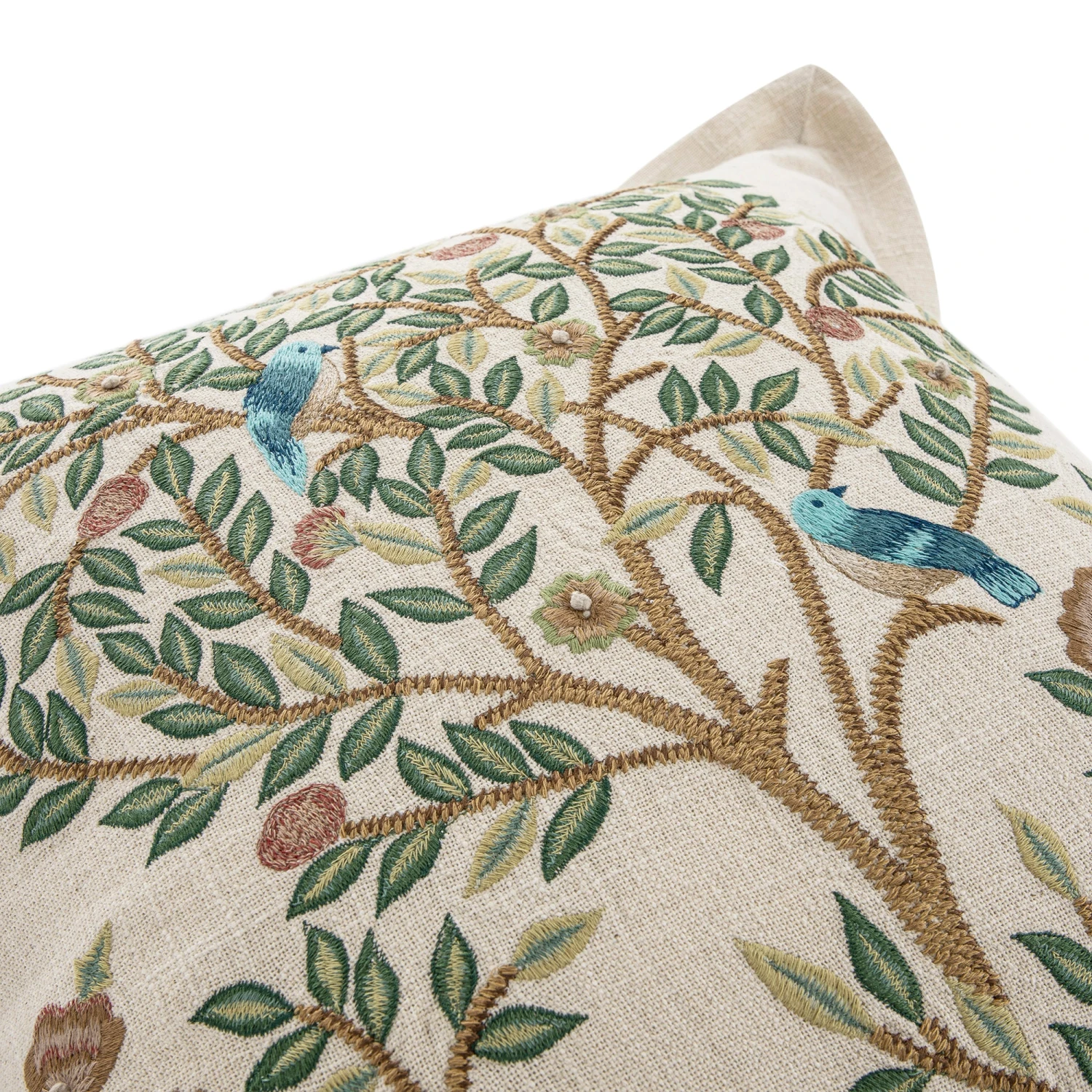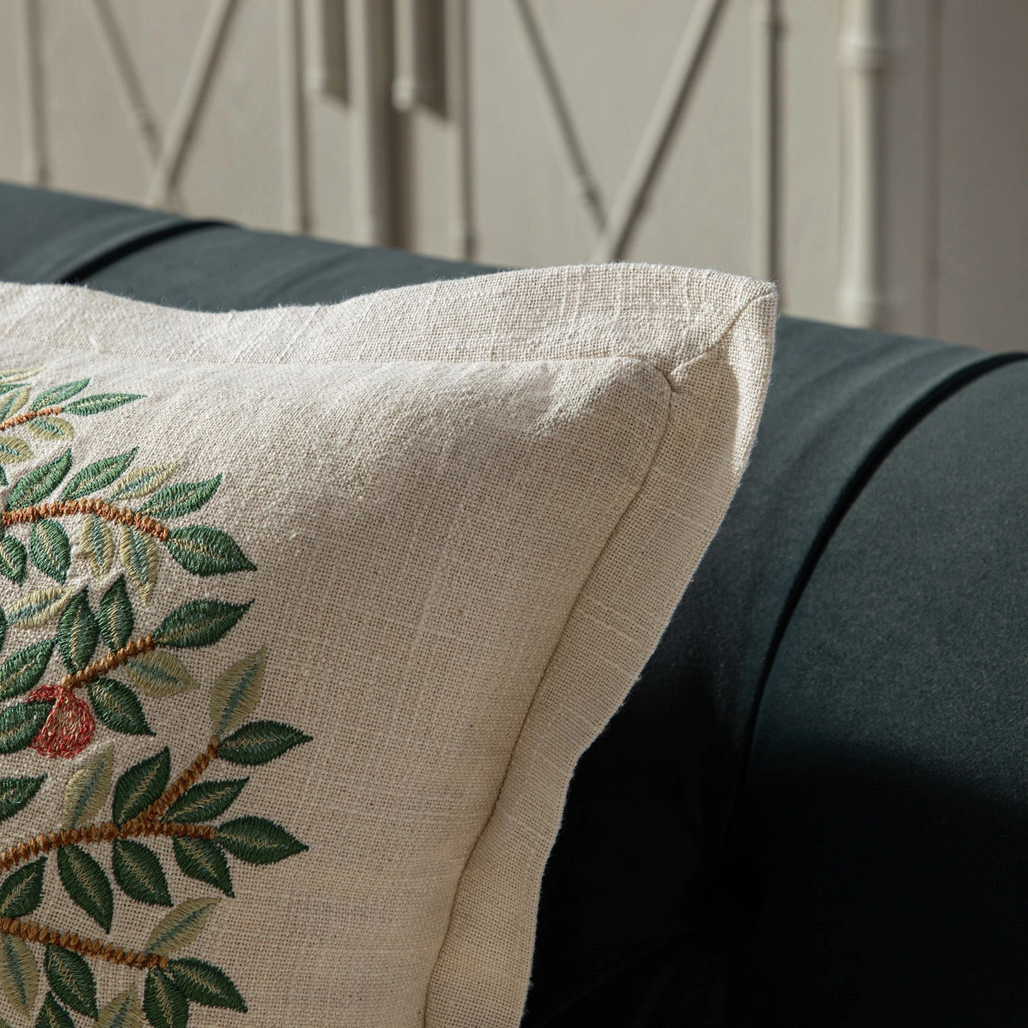 This cushion features a stunningly detailed Tree of Life motif, showcasing a vibrant scene of birds, flowers, and foliage. Each element is brought to life using traditional cotton thread embroidery and intricate handmade French knots, set against a rich, textured cream cotton slub background. The natural variations in the fabric base provide a unique, organic feel that perfectly complements the traditional embroidery techniques.