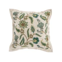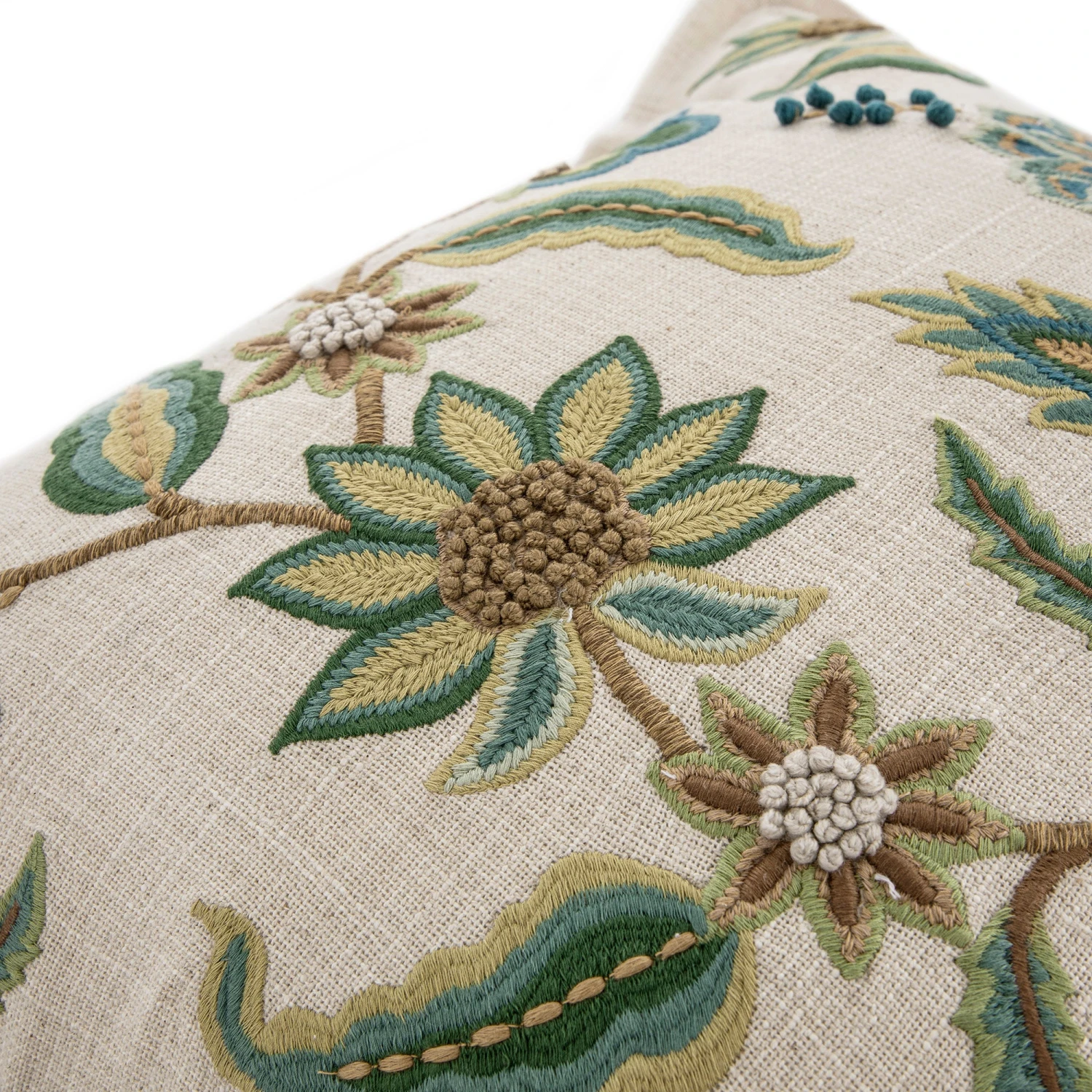 The Flora & Fauna Jacobean Oasis Cushion is a stunning centerpiece inspired by traditional Jacobean crewelwork. Featuring a rich tapestry of hand-embroidered birds, winding flowers, and lush foliage, this cushion brings a sophisticated botanical aesthetic to any room. The intricate design is rendered on a natural cotton slub base, where the characteristic uneven knots of the fiber provide a rustic, high-end texture that contrasts beautifully with the refined embroidery and tactile French knots.